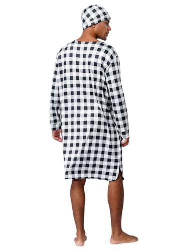 ACSUSS Men Nightgown Plaid Printed Nightshirt with Sleeping Cap Mid-length V-neck Nightdress Black Medium 6