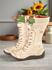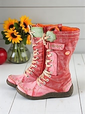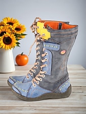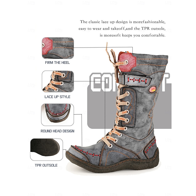 More information about Women's Genuine Leather Lace-Up Mid-Calf Boots with Side Zipper and Colorful Stitching, Vintage Casual Fashion Boots for Winter Outfits & Outdoor Wear