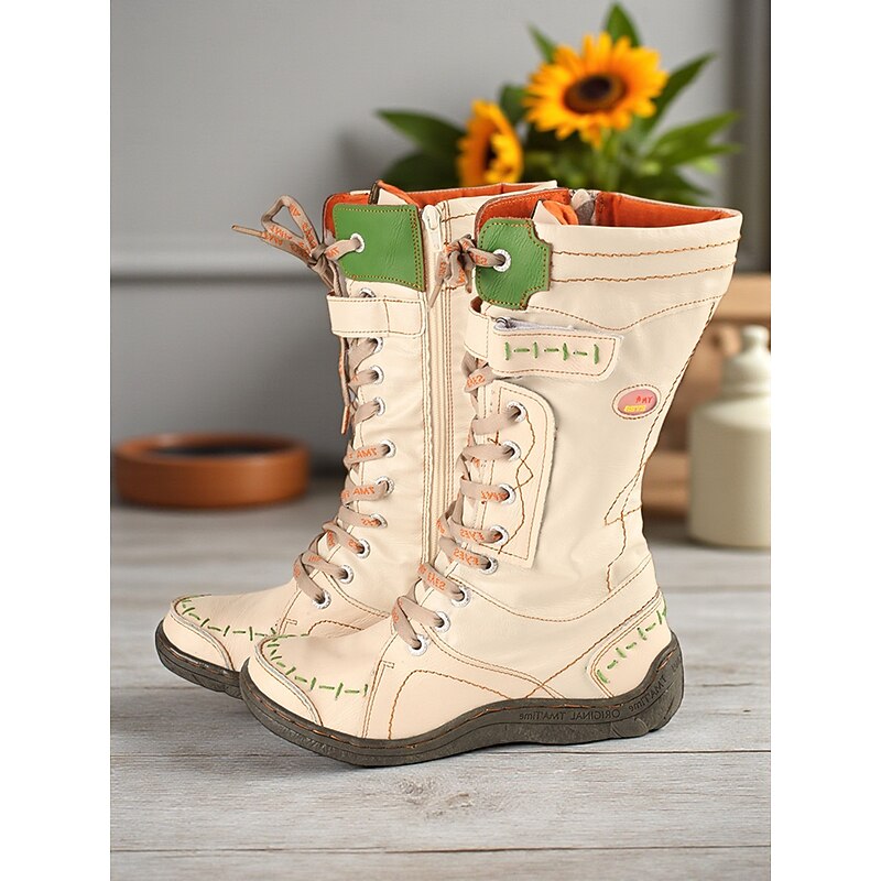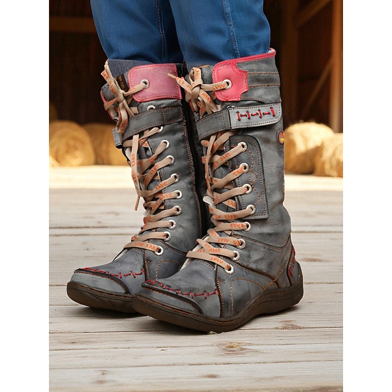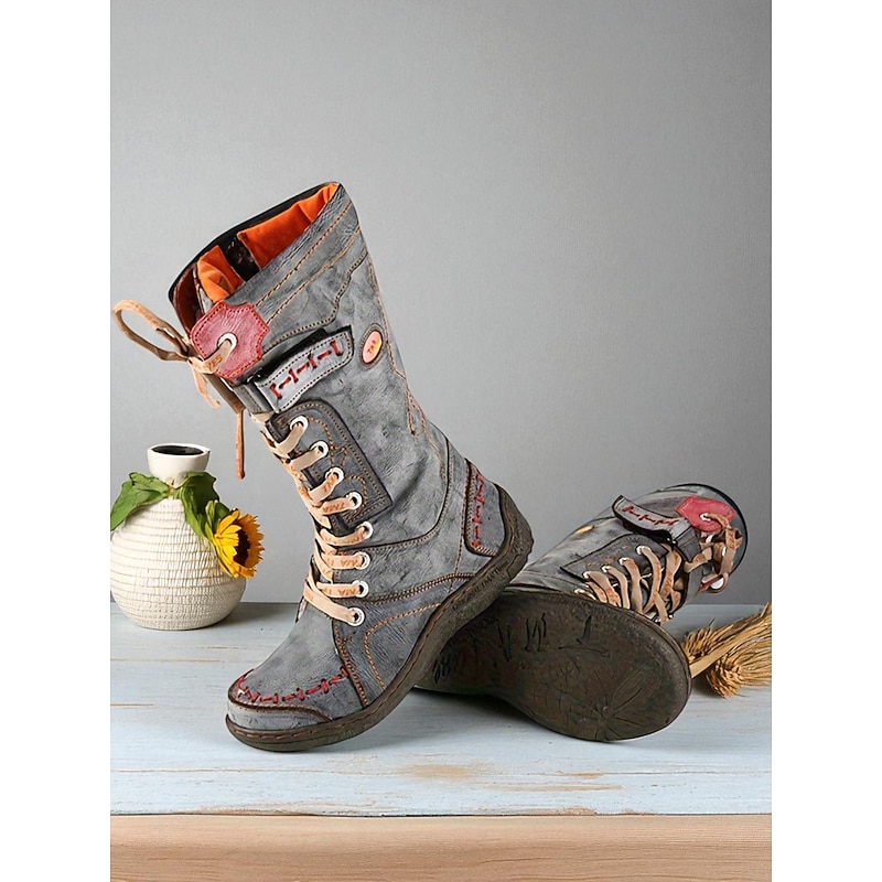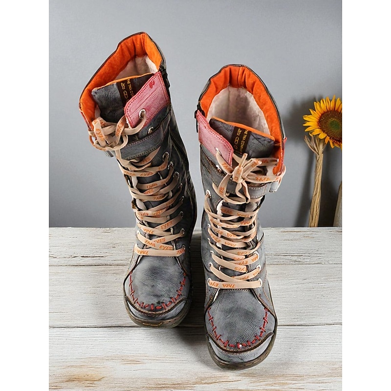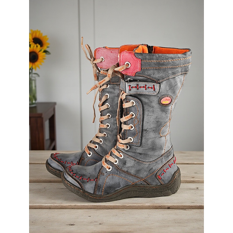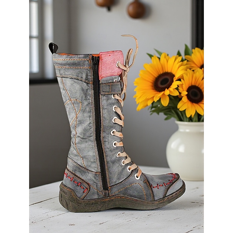 HOT ! Women's Genuine Leather Lace-Up Mid-Calf Boots with Side Zipper and Colorful Stitching, Vintage Casual Fashion Boots for Winter Outfits & Outdoor Wear