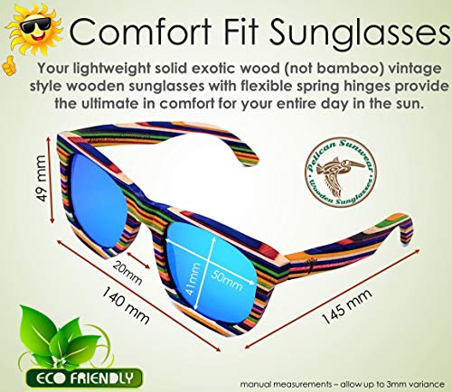 • QUALITY: Every pair is hand made from the finest wood and uses high-quality stainless-steel spring hinges. The High Definition Polarized 1.1 mm TAC resin lenses are anti-reflective and are rated UV400 to provide 100% UV (UVA/UVB) protection.