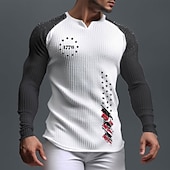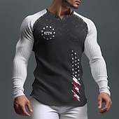 Highlights [Fabric] : Crafted from a blend of cotton and polyester, this men's long-sleeve waffle shirt ensures both comfort and durability. The micro-elastic fabric offers a subtle textured pattern that enhances the overall feel of the shirt, making it suitable for spring and fall wear. [Fit] : The regular fit and raglan sleeve cut provide a sporty and relaxed silhouette, designed to complement a range of body types. This shirt is perfect for showcasing a toned physique while offering freedom of movement. [Design Highlights] : Featuring a dynamic 3D print, this shirt includes a graphic design with stars and "1776", giving it a historical and patriotic theme. The contrast between the deep charcoal gray body and white sleeves creates a striking two-tone look, while diagonal stripes in red and white add an extra pop of color and style. [Occasions] : Ideal for a variety of activities and events, this shirt is perfect for sports, outdoor adventures, holidays, and casual outings. Its versatile style transitions seamlessly from daily wear to more festive settings. [Size Range] : Available in a broad size range from S to 3XL, catering to a wide audience. Select your perfect fit for a look that combines both functionality and style.