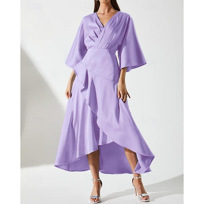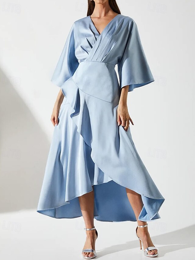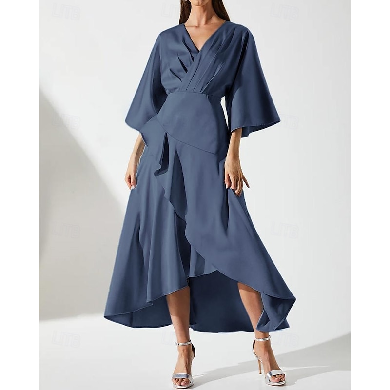 More information about SkyA-Line Mother of the Bride Dress Elegant Simple Luxurious V Neck Asymmetrical Floor Length Wedding Guest Dress Satin 3/4 Length Sleeve with Pleats Ruffles