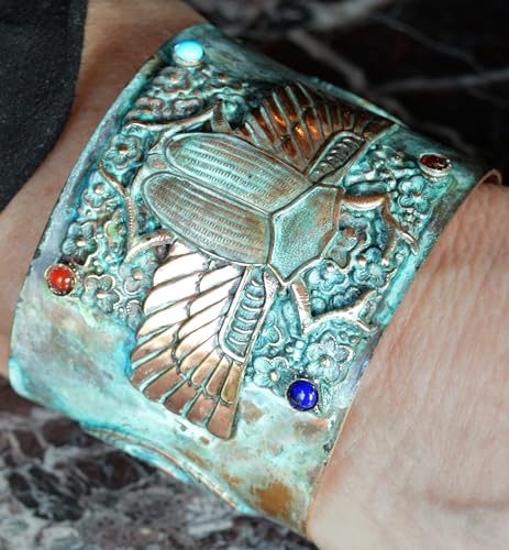 HOT ! Elaine Coyne Collectible Artwear - Carnelian, Turquoise, Scarab, Navy Onyx Bracelet for Women, Handmade Egyptian Motif Wide Cuff Bracelet, Patina Solid Brass Wrist Carnelian Bracelet, 2-Inch Wide Cuff