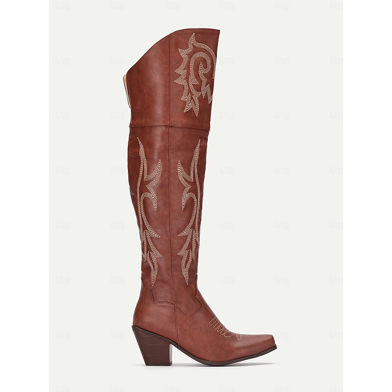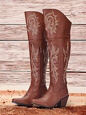Highlights [Fabric and Material] : Expertly crafted from high-quality PU and synthetic leather lining, these women's cowboy boots offer a durable and robust wear, while maintaining a luxurious feel. The rubber outsole ensures excellent traction and long-lasting durability. [Fit and Style] : Designed as vintage over-the-knee boots, they feature a square toe and a chunky heel that offers both comfort and a trendy edge. The knee-high silhouette enhances the leg line, making these boots a flattering choice for a variety of outfits. [Design Highlights] : Intricate embroidered detailing on the rich brown exterior adds a classic western flair to these boots. A convenient side zipper allows for easy wear, complemented by a sturdy chunky heel that combines style with modern comfort. [Occasions] : Perfect for daily outings, workdays, and outdoor adventures, these boots add a rugged, chic edge to any ensemble. Whether attending a rodeo or a country concert, they effortlessly blend classic style with contemporary versatility. [Size and Suggestions] : Available in a wide range of sizes from US5 to US13, these boots adhere to standard sizing. It is recommended to select your usual size for the best fit.