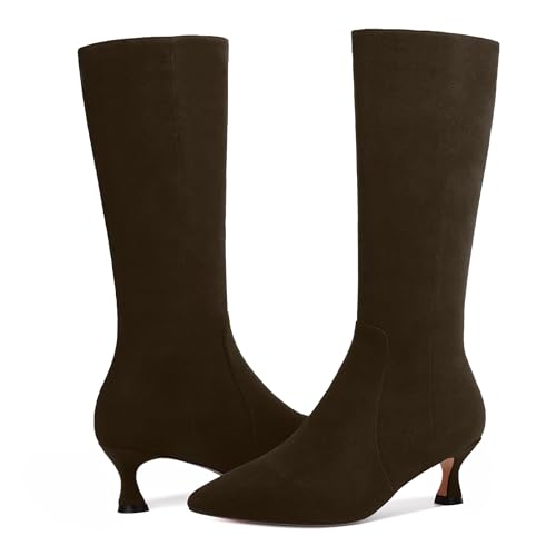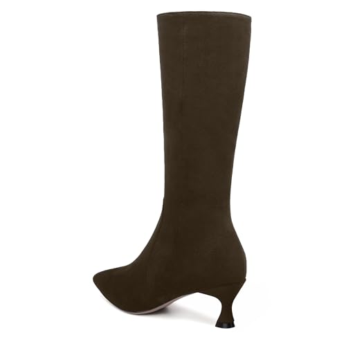 trending ! FEMSTEP Womens Sexy Suede Pointed Toe Party Zip Kitten Low Heel Knee High Boots 2 Inch