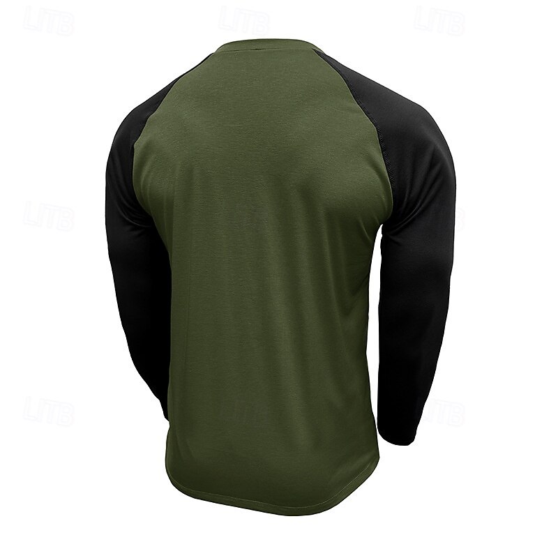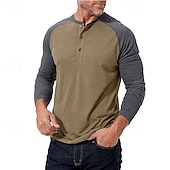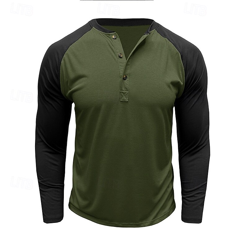 Highlights [Fabric] : Crafted from a high-quality cotton blend, this men's raglan Henley shirt offers comfort and breathability, ensuring a soft touch and lasting durability. The fabric's micro-elasticity provides ease of movement for daily wear. [Fit] : With a regular fit, this shirt is designed to complement the male physique without being too tight or too loose, offering a balanced silhouette that aligns with contemporary fashion trends. [Design Highlights] : Showcasing a stylish color block pattern, this Henley shirt features two-tone olive green and charcoal gray, lending a modern and sporty aesthetic. The patchwork details and classic three-button placket enhance the shirt's distinctive design elements. [Occasions] : Ideal for a variety of settings, this versatile top is perfect for casual daily wear, vacations, street outings, or simply going out. Its stylish yet comfortable design makes it suitable for both relaxed and slightly more formal occasions. [Size Range] : Available in sizes S to XXL, this shirt caters to a wide range of body types, ensuring a good fit for adults seeking fashionable and comfortable apparel.