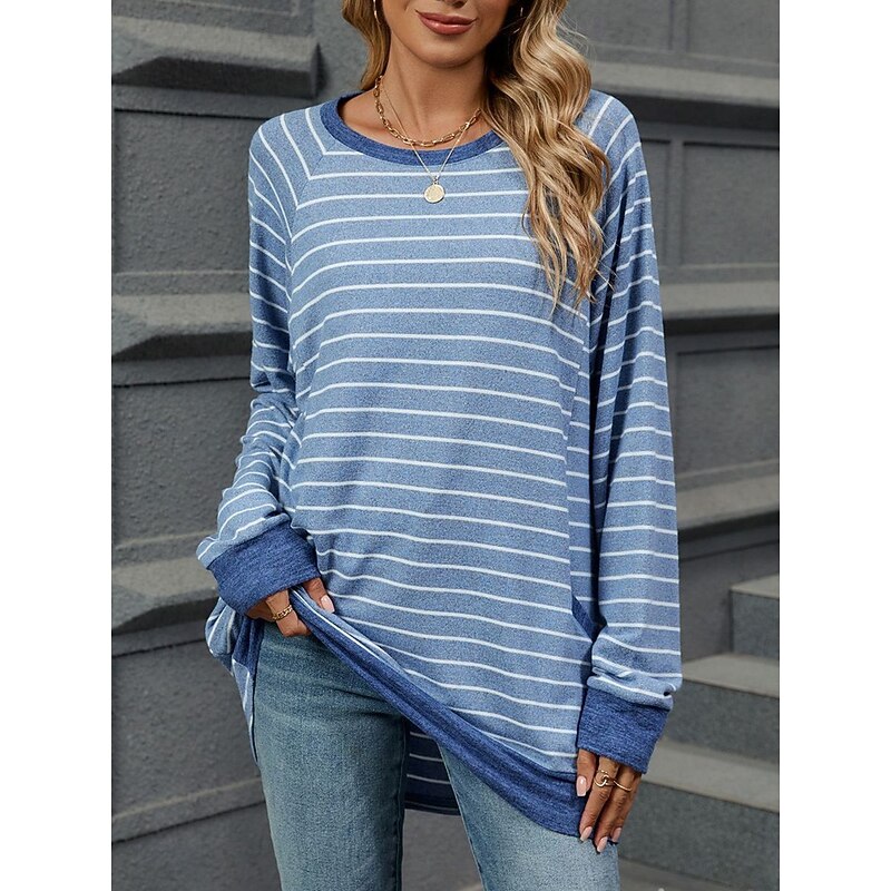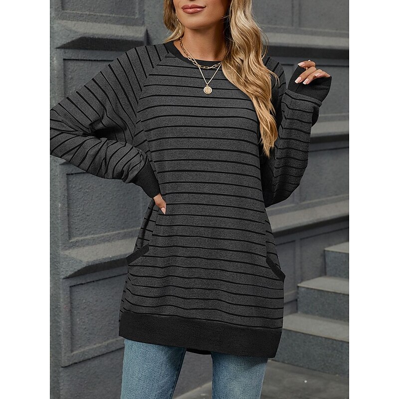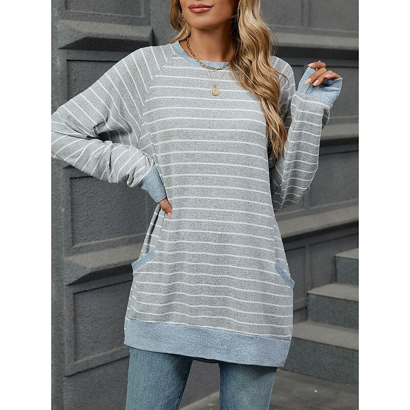 Highlights [Fabric and Style] : Crafted from high-quality polyester, this women's long-sleeve T-shirt offers a micro-elastic and comfortable fit, suitable for fall and winter seasons. The fabric's soft texture makes it ideal for daily wear, ensuring warmth and style during cooler days. [Design Highlights] : This T-shirt features a modern and casual design with a classic crew neck. The light gray background is stylishly adorned with horizontal white stripes, giving it a chic and timeless appeal. The raglan sleeves offer a relaxed fit, and the ribbed cuffs and hem add a snug touch to the overall look. Front pockets enhance its casual and cozy vibe, making it a versatile addition to your wardrobe. [Occasions] : Perfect for everyday activities, weekend outings, and casual gatherings. Whether you're heading out for a relaxed weekend brunch or running daily errands, this T-shirt effortlessly blends fashion with comfort, making it a must-have for various occasions. [Size Range] : Available in a wide range of sizes from S to 2XL, ensuring a suitable fit for different body types and preferences. This versatile T-shirt can be easily paired with jeans or casual trousers for a polished yet laid-back ensemble. [Care Instructions] : Easy to care for with options for both machine wash and hand wash, maintaining the fabric's quality and longevity with regular use.