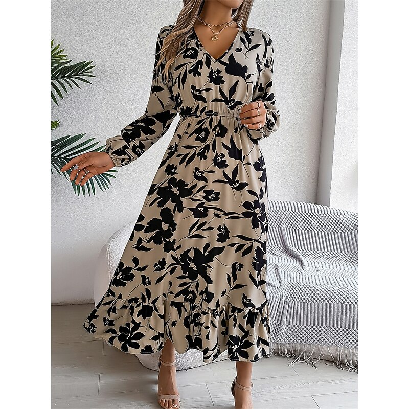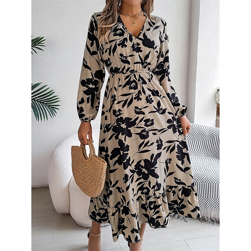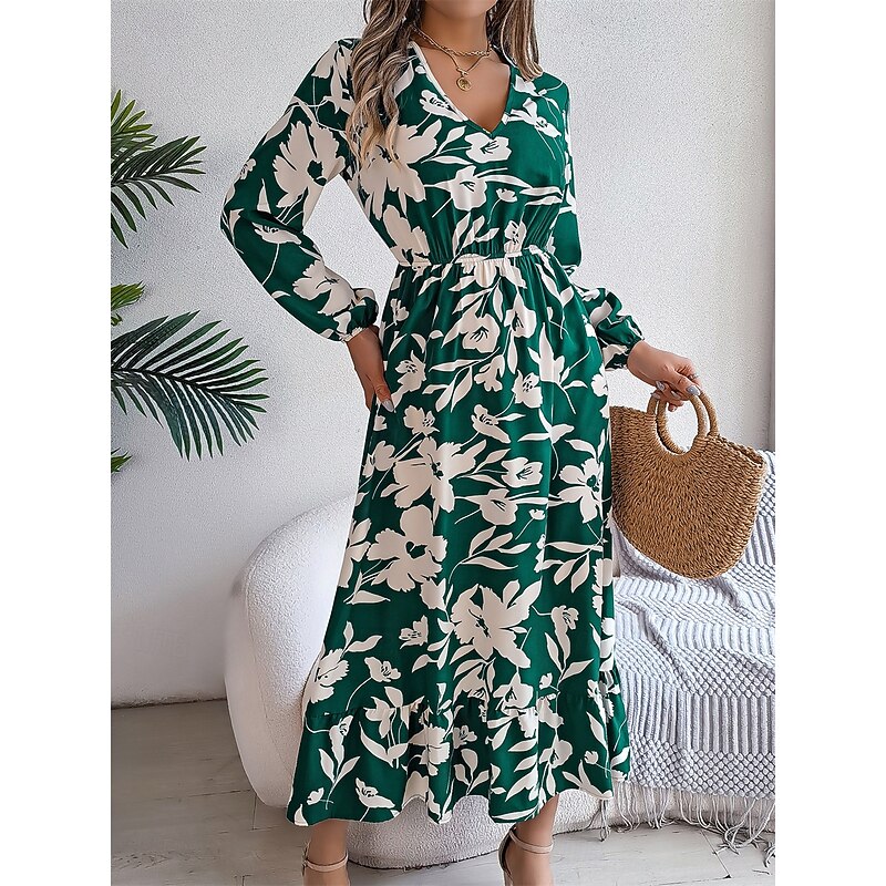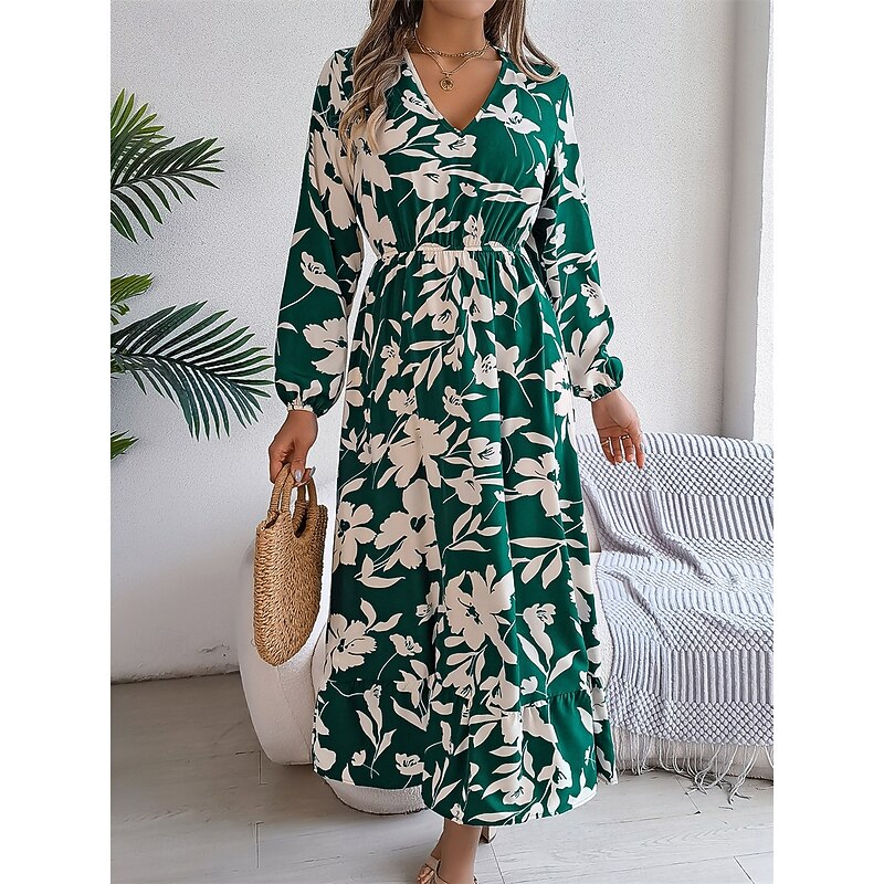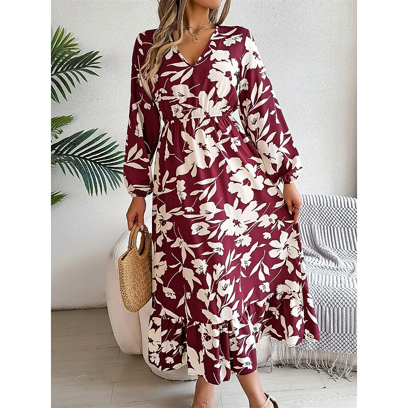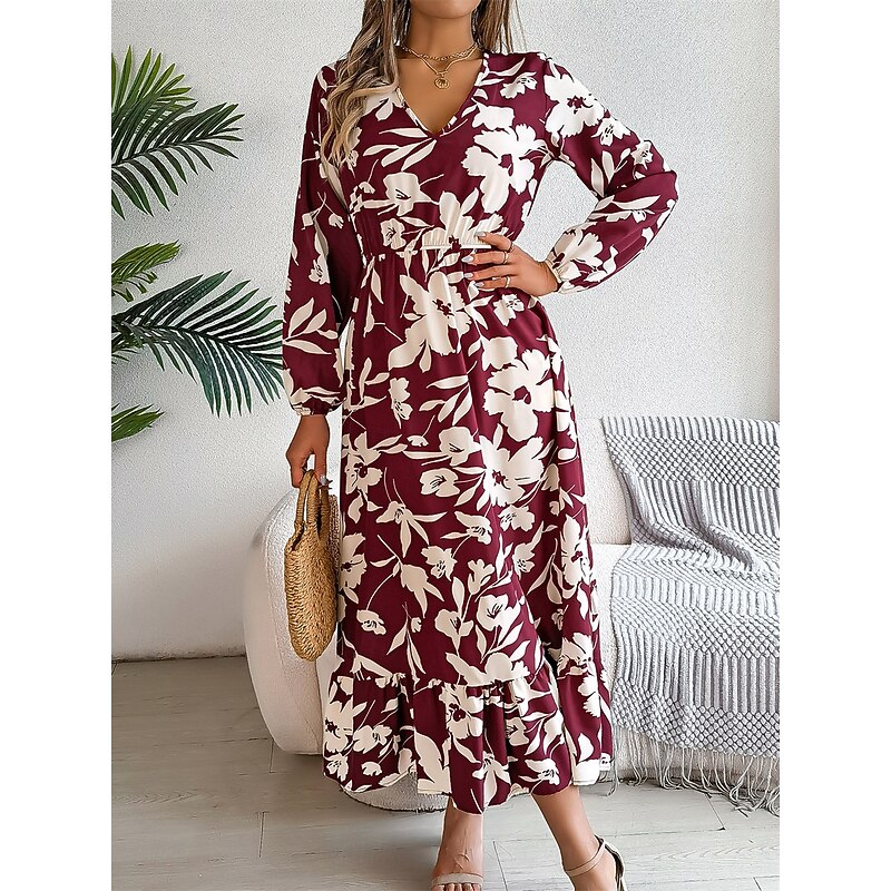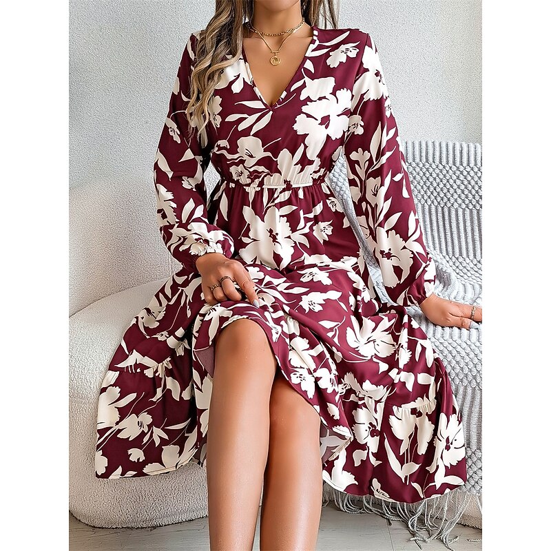 More information about Women's Midi Dress Casual Dress Swing Dress A Line Dress Casual Daily Regular Fit Floral Long Sleeve V Neck Wine Green Khaki Summer Spring Fall