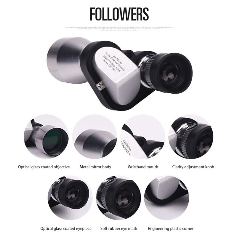Highlights Product Selling Points: 1. Miniature high definition telescope manufactured by Seiko. 2. Features a ratio of 8 times and a caliber of 18mm. 3. Offers a wide object diameter of 20mm. 4. Provides a field angle of 5.5 degrees for a broad view. 5. Boasts a kilometer horizon of 96M/1000M for long-distance observation. 6. Equipped with an exit pupil diameter of 2.1mm and exit pupil distance of 9.8mm for comfortable viewing. 7. Offers a magnification of 7 for detailed observations. 8. Allows for near focus of 5m, making it suitable for close-up observations. 9. Features a foldable eye cup for added convenience. 10. Made with high-quality Bak7 prism material for enhanced clarity. 11. Compact dimensions of 75mm (length) x 24mm (diameter) x 36mm (thickness) for easy portability. 12. Utilizes an optical lens and FMC full wideband blue film coating for clear and bright images. 13. Comes with an eye mask for both myopic and non-myopic users. 14. Equipped with a high-definition blue film optical lens for clear visibility, even during nighttime. 15. Nitrogen filling ensures waterproof functionality, making it suitable for outdoor use.