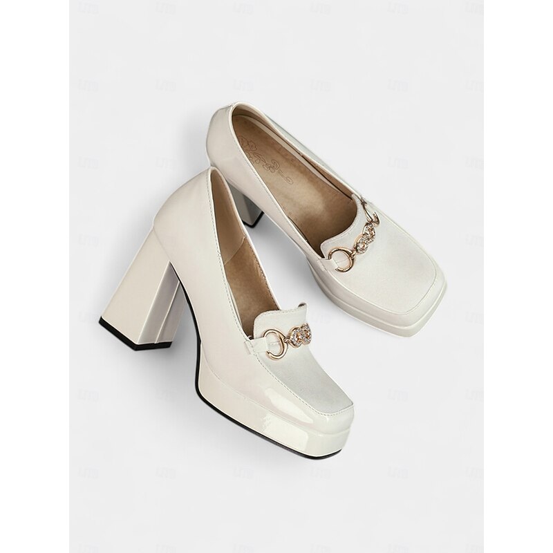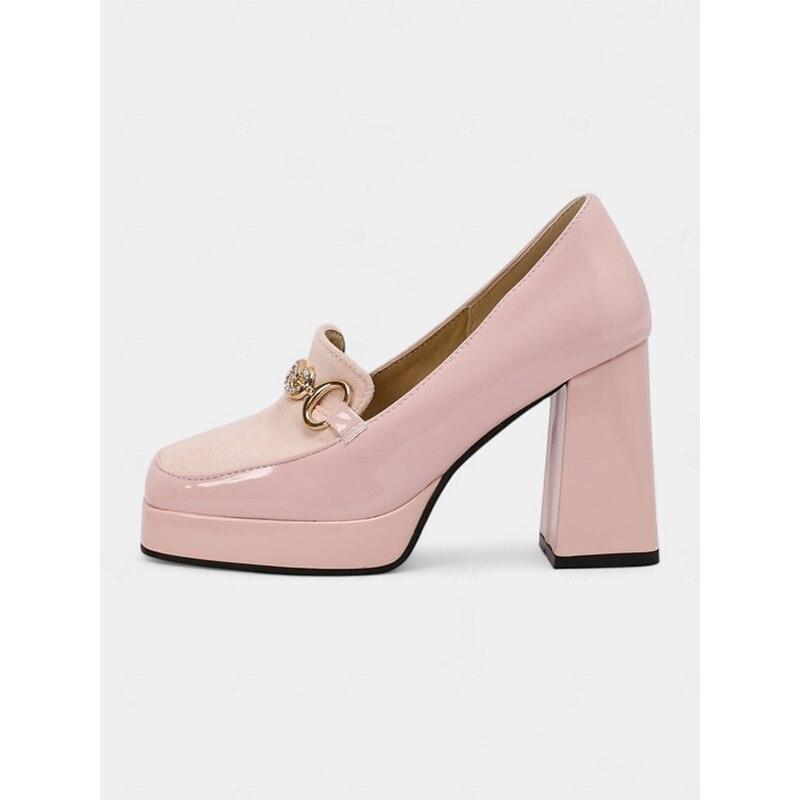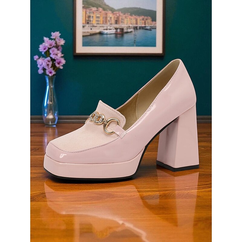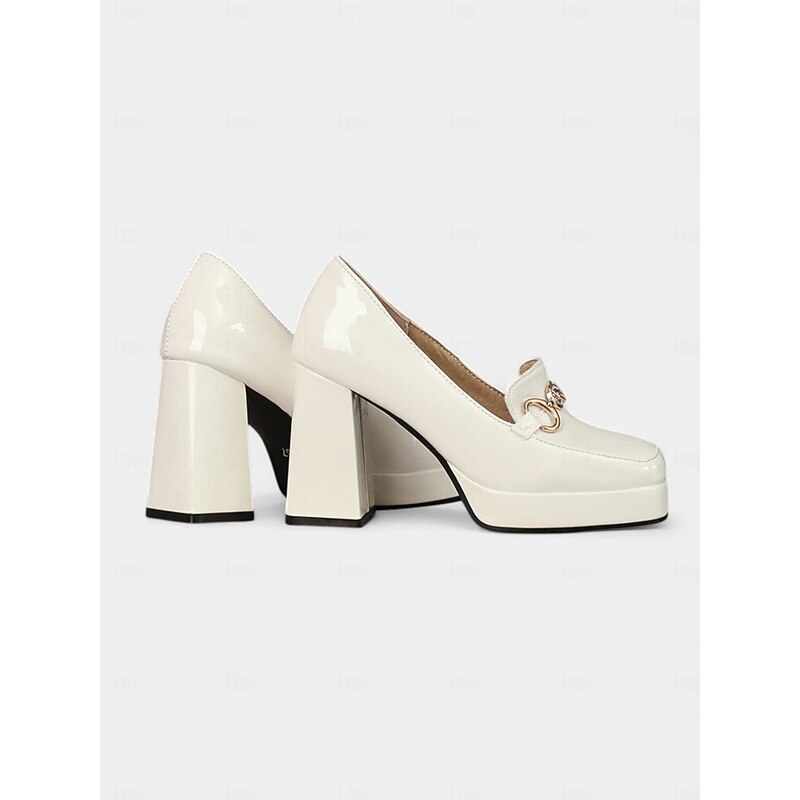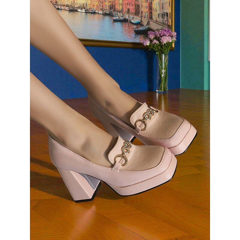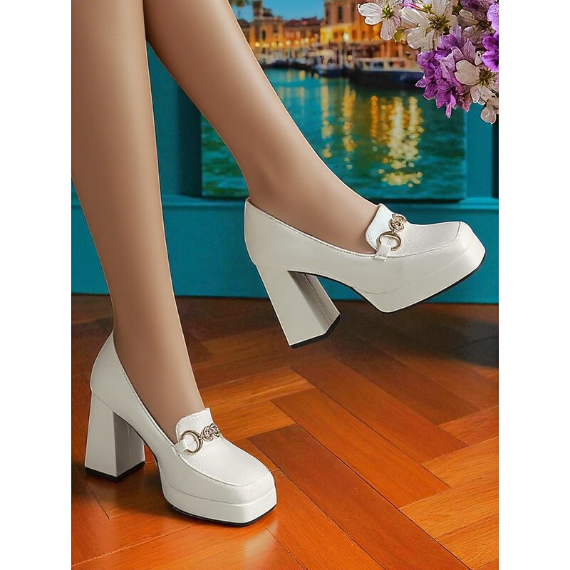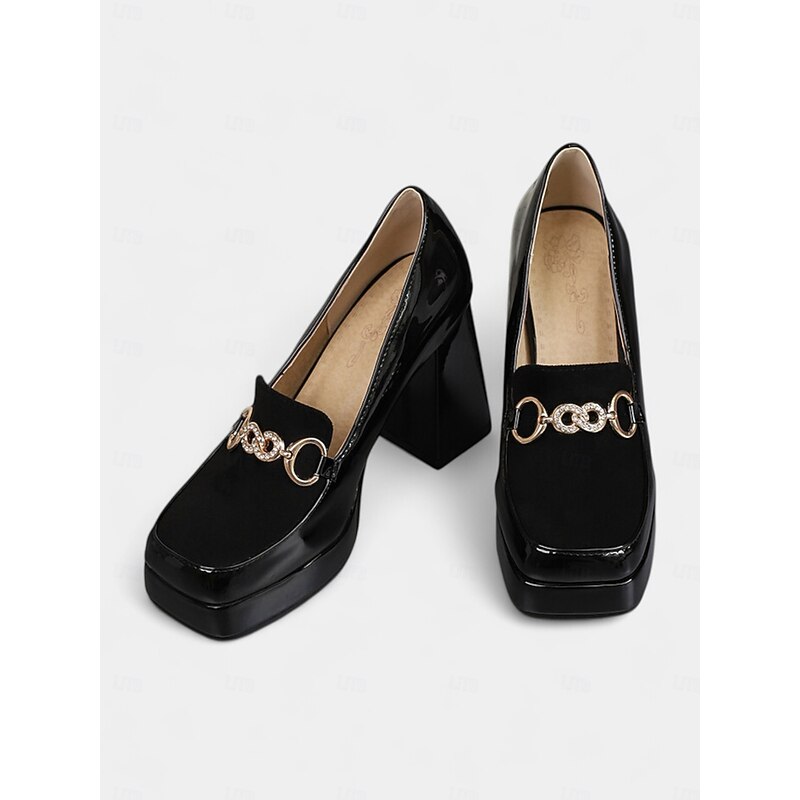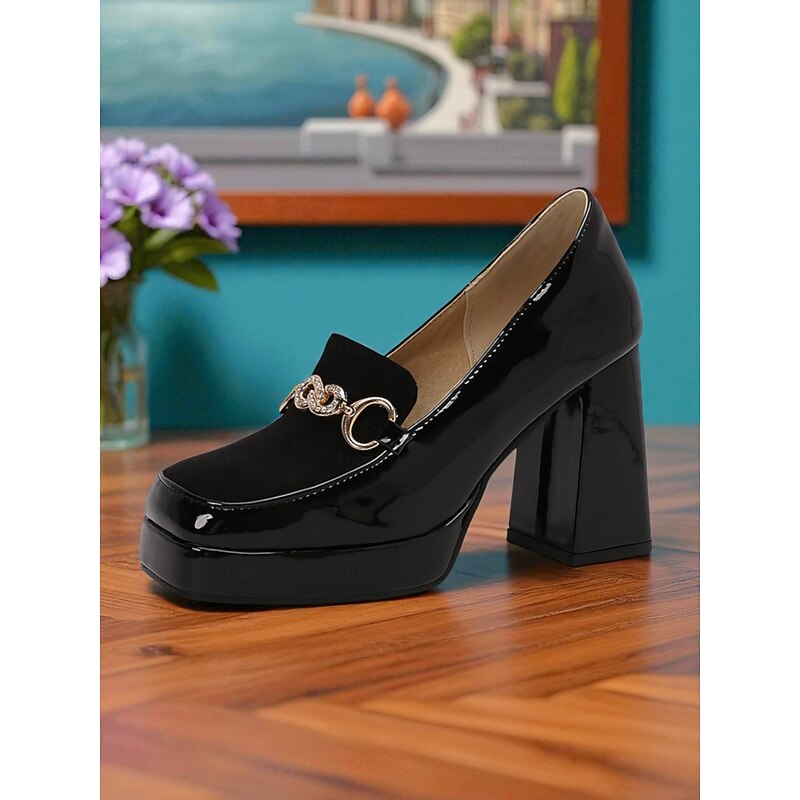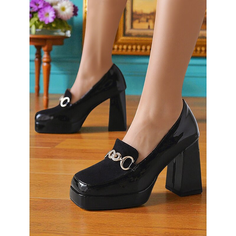 Women's Yellow Patent Leather Platform Loafers with Block Heels and Chain Detail –  Retro 1980s Style Heeled Pumps for Office, Parties and Vintage Outfits 19