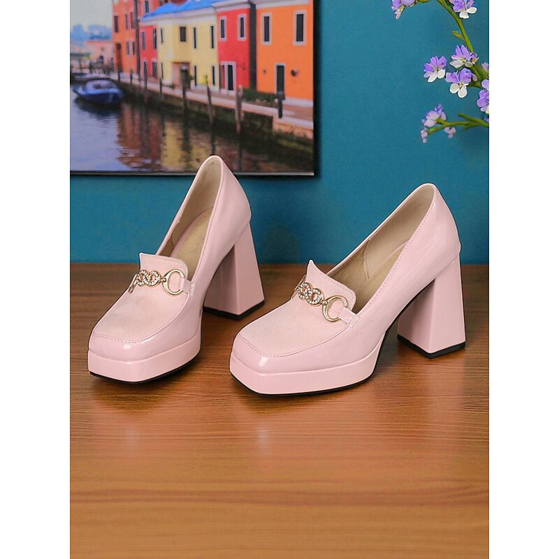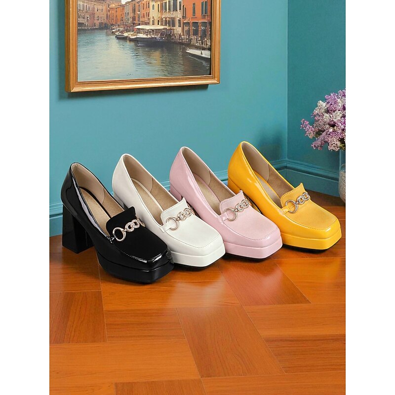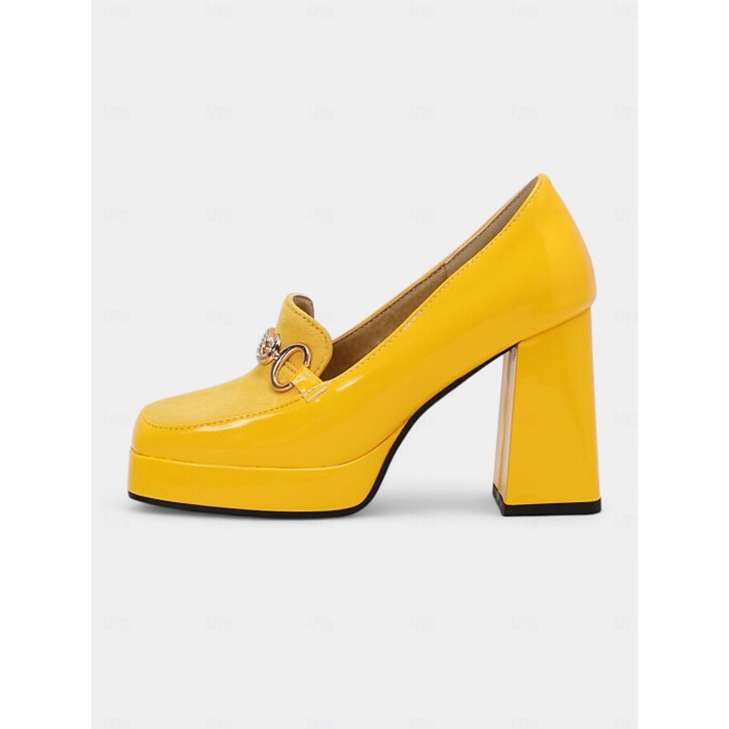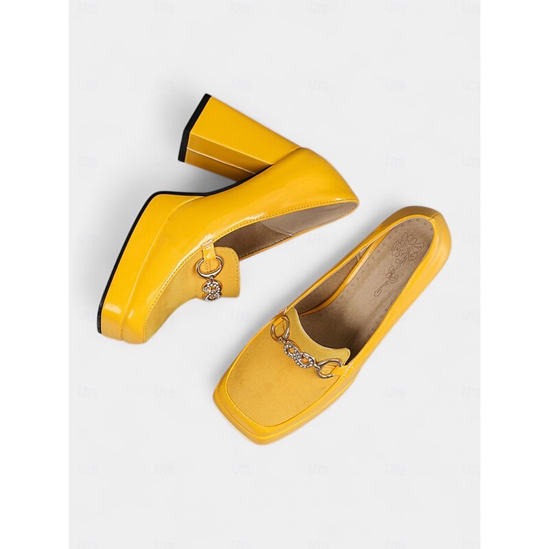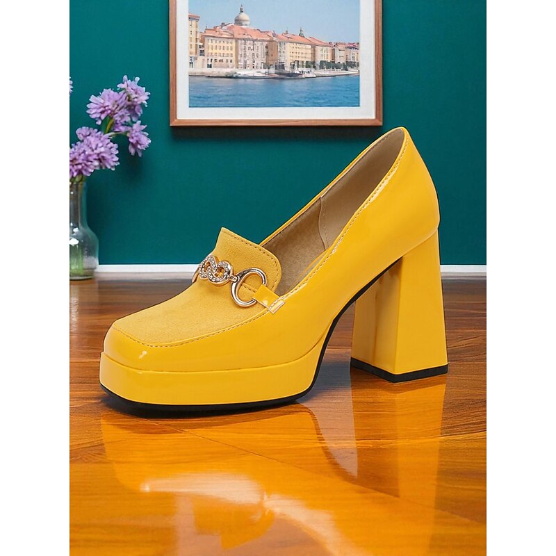 Women's Yellow Patent Leather Platform Loafers with Block Heels and Chain Detail –  Retro 1980s Style Heeled Pumps for Office, Parties and Vintage Outfits 24