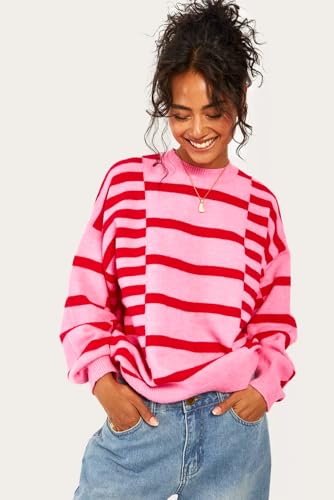 • ① 《Trendy Striped Design》: The Pink Stripe Bubble Sleeve Drop Shoulder Ribbed Trim Sweater features a classic yet trendy striped pattern that adds a stylish flair to your wardrobe.