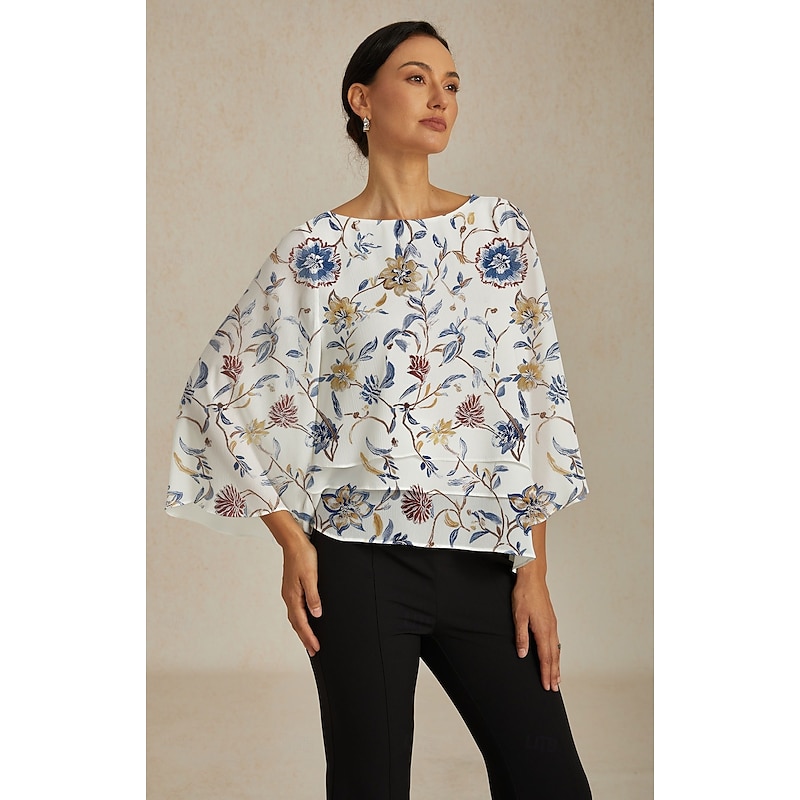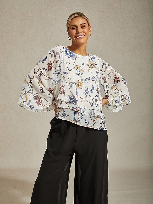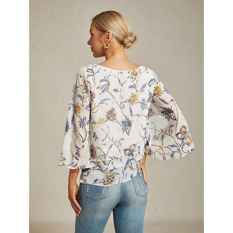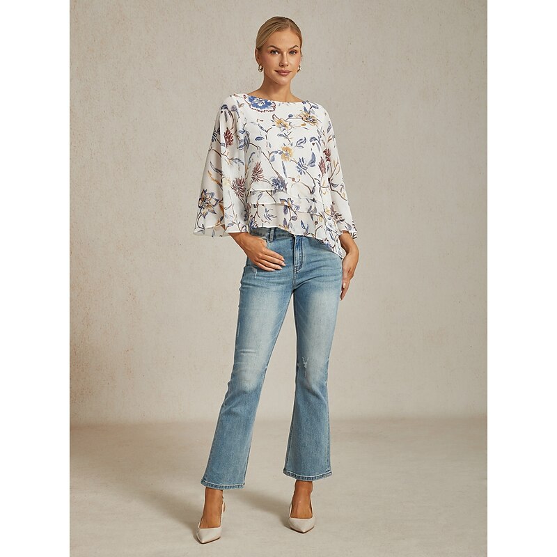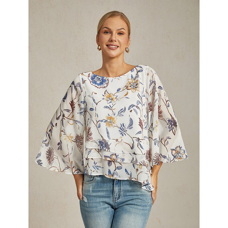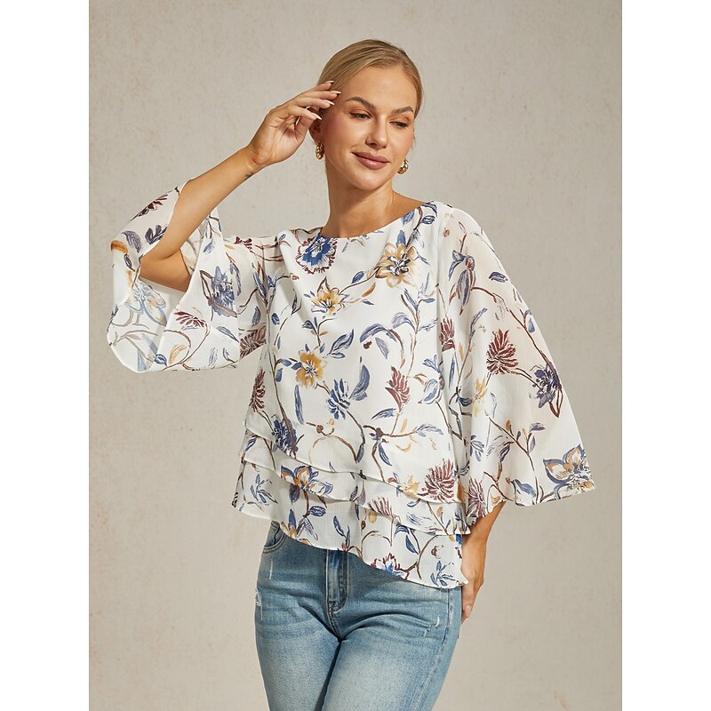 HOT ! Women's Floral Print Layered Top with Bell Sleeves – Loose Fit Tiered Blouse in Lightweight Crepe Fabric