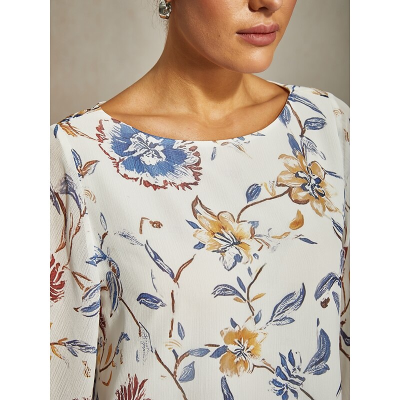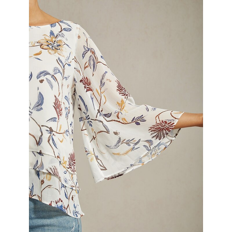 Women's Floral Print Layered Top with Bell Sleeves – Loose Fit Tiered Blouse in Lightweight Crepe Fabric 8