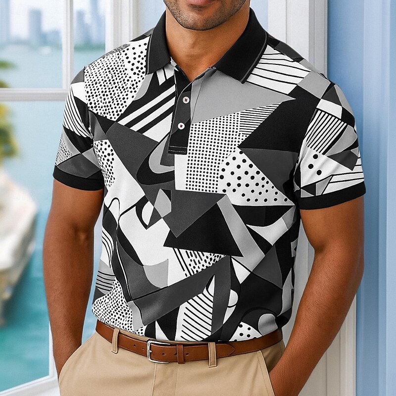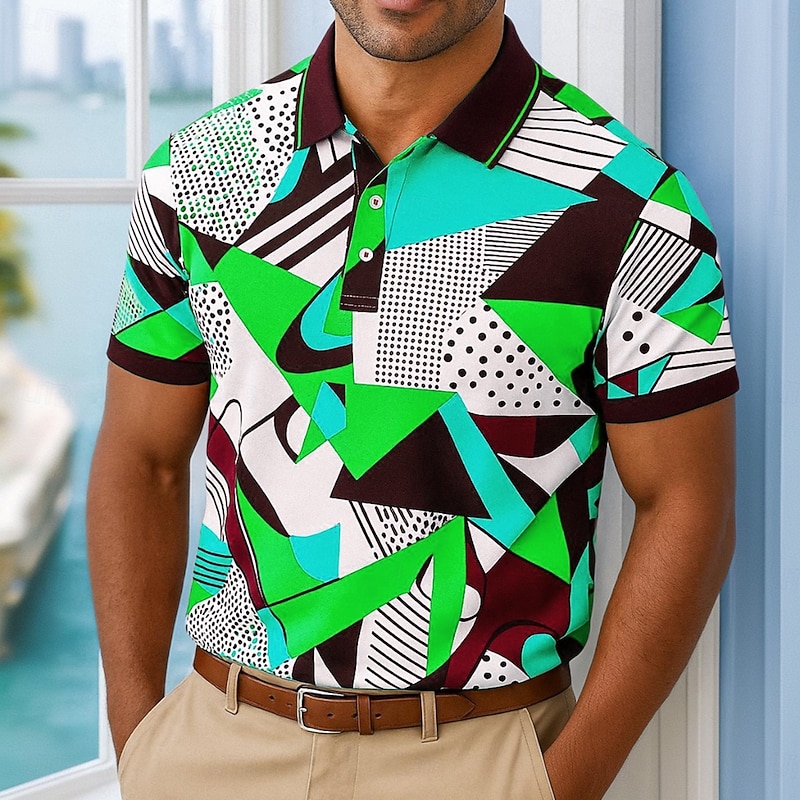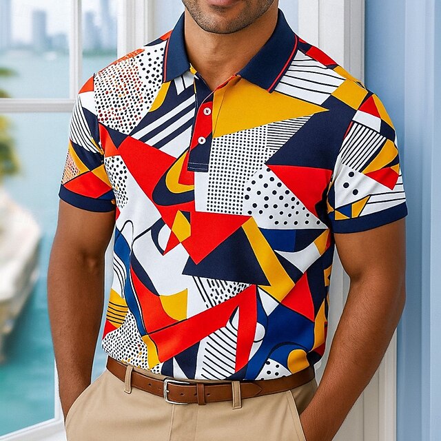 HOT ! Men's Polo Casual Turndown Short Sleeve Geometric Abstract Buttons Summer Regular Fit Black Multicolor Orange Green Polo