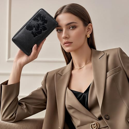 • PU Leather Wallet: The leather is soft and shiny, not easy to have wrinkles, the blackwomens leather wallet is waterproof. Floral pattern women's wallet is elegant and luxurious, is a women's designer wristlet wallets