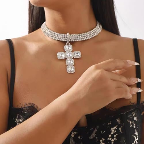 Cross Rhinestones Choker Necklaces for Women Sparkly 4 Row Diamond Tennis Necklace Statement Fashion Crystal Crucifix Pendant Chain Luxury Bridal Wedding Party Prom Jewelry 5