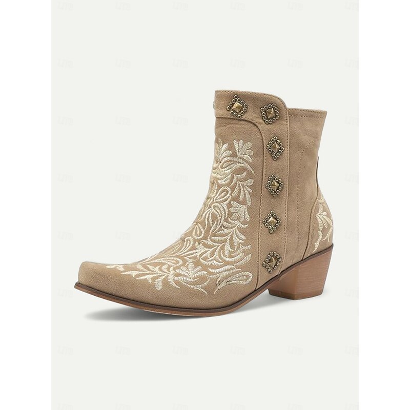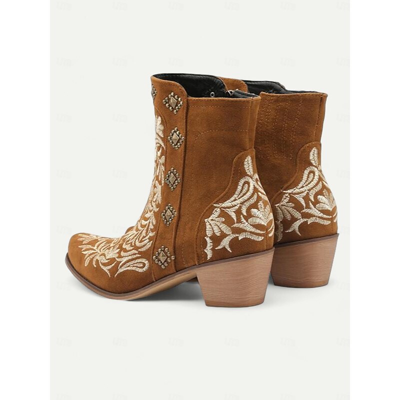 Highlights [Material & Craftsmanship] : Crafted from premium faux suede, these Western ankle boots offer durability and a stylish finish. The embroidered floral design in contrasting white, combined with decorative rivets, elevates the classic cowboy aesthetic to a sophisticated level. [Fit & Style] : Featuring a mid-calf height and a classic round toe, these boots exude the traditional Western vibe with a modern twist. The chunky heel ensures stability and comfort for all-day wear, and the inner zip closure provides a secure fit, enhancing the ease of use. [Design Highlights] : The standout floral embroidery and decorative studs along the shaft bring an elegant touch to your ensemble, while the color block pattern adds a contemporary edge. These boots are perfect for incorporating a vintage flair into both casual and themed looks. [Occasions] : Versatile and chic, these boots are ideal for a range of events, including everyday outings, work, and outdoor activities. Whether you're dressing for a casual day out or a themed rodeo event, these boots are sure to complement your style effortlessly. [Size Notice] : Available in a range of sizes from US5.5 to US10.5, these boots fit true to size, so simply select your usual size to ensure the perfect fit.