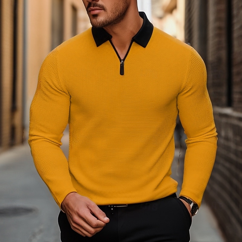 More information about Men's Waffle Polo Shirt Golf Shirt Outdoor Causal Quarter Zip Long Sleeve Fashion Modern Solid Color Knitted Spring & Fall Standard Fit White Yellow Pink Light Grey Waffle Polo Shirt