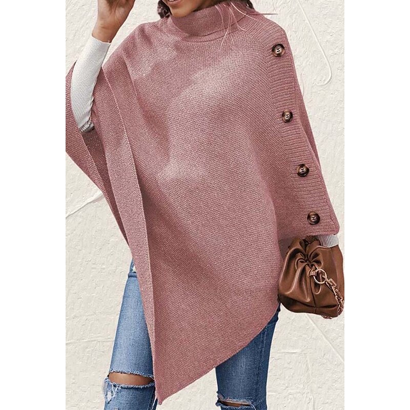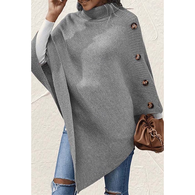 Featuring a chic turtleneck for added warmth, this poncho boasts an asymmetrical hemline that lends a modern touch to its design. Decorative buttons on one side add a sophisticated detail to the overall look.