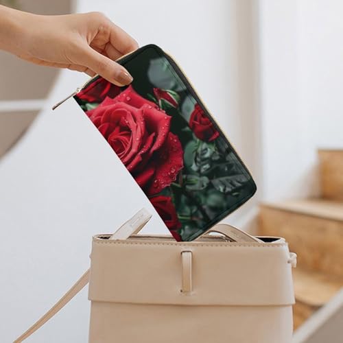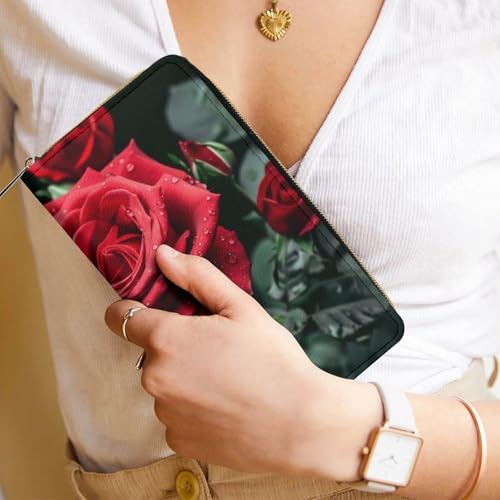 Red Rose Print Long Wallet for Women Men PU Leather Card Holder Organizer with Zipper Coin Pocket & Cash Slots 1