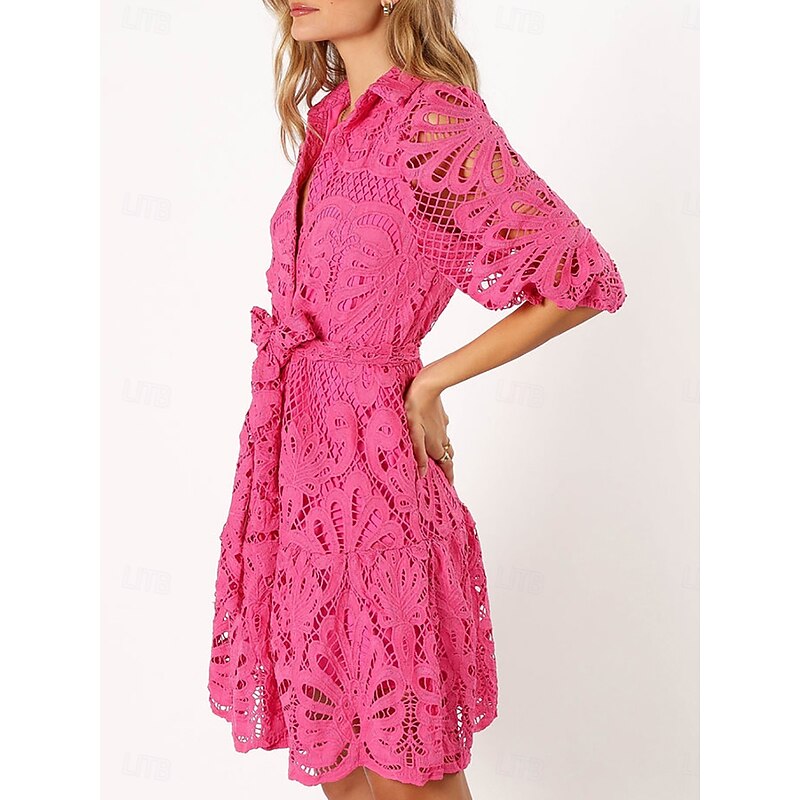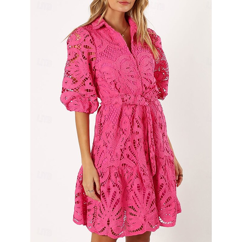 Highlights [Fabric] : Crafted from high-quality polyester, this lace dress offers a lightweight and breathable experience, keeping you comfortable throughout the day and evening. [Silhouette] : The dress features a loose fit A-line silhouette that gently drapes over the body, providing a flattering look for various body types. [Design Highlights] : The sophisticated lace dress boasts intricate hollow-out patterns that highlight its elegance. It has a shirt collar and a stylish button-down front, while the three-quarter sleeves add a graceful touch. The dress is cinched at the waist with a matching belt for an enhanced silhouette. [Occasions] : Perfect for dates, street outings, or elevating your everyday wardrobe with a touch of elegance. Whether attending a casual lunch or a day out in the city, this dress caters to a variety of occasions. [Size Range] : Available in sizes S, M, L, and XL, offering a suitable fit for a wide range of body types.