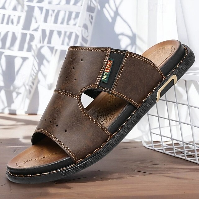 Men's Brown Cutout Slip-On Sandals, Soft Faux Leather Summer Slides for Indoor Comfort, Weekend Errands and Casual Outdoor Use 17