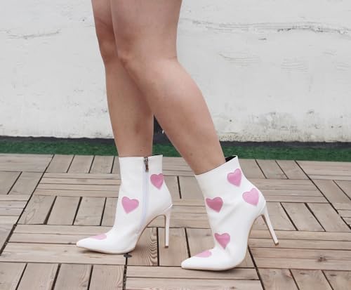 Frankie Hsu Women's Luxury Classic Large Size Cute Pink Heart-Shaped White Patent Leather High Heels Ankle Heeled Kitten Boots Bootie Shoes 4