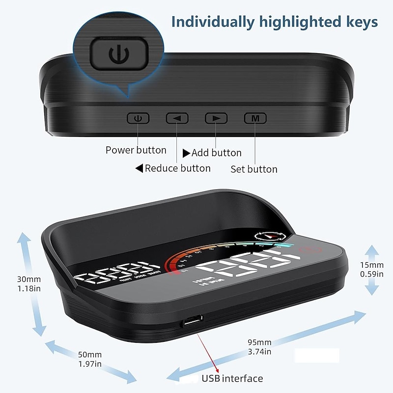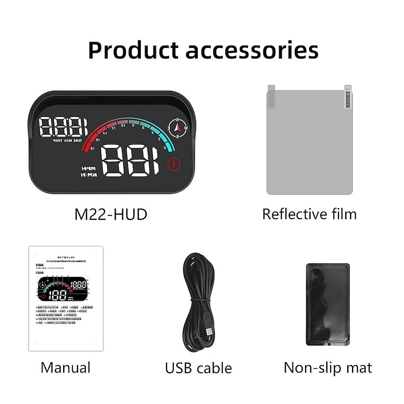 Highlights Product Selling Points: 1. High-Definition LED with Auto Brightness Adjustment: Experience a comfortable and clear visual display with the high-definition LED that automatically adjusts its brightness based on lighting conditions. 2. GPS+Beidou Dual Mode: Enjoy a smooth and accurate speed display with the high-refresh-rate 10Hz GPS+Beidou dual-mode chip. The speed information is continuously updated and displayed seamlessly at a refresh rate of 10 frames per second. 3. Key Functions: Stay informed about essential driving information at a glance. The electronic head up display shows speed, time, single trip duration, single trip distance, driving direction, satellite signal strength, vehicle speed, and current time. It automatically switches from displaying speed to time when the speed is zero. 4. GPS Compass: Navigate with ease and maintain a stress-free driving experience with the built-in GPS compass. It shows the direction of travel, offering real-time satellite synchronization for automatic time calibration. It also provides over speed alert and fatigue driving alert to help maintain safe driving habits. 5. Innovative Windshield HUD Design: The M22 is a GPS mode head-up display that utilizes the windshield characteristics to create a new windshield HUD. The simple screen design presents only the most important speed data, ensuring clear visibility without obstructing the driver's view. 6. Speeding Alarm and Fatigue Warning: The M22 displays speed with alarm functions to alert you when you exceed the speed limit or have been continuously driving for too long. This acts as a safety supervisor, reminding you to pay attention to driving safety. 7. Automated and Convenient: The M22 features advanced light-sensitive elements that automatically adjust the brightness according to the surrounding light conditions. It also turns on and off with the car, providing convenience without worrying about manually turning it off. When not in use for an extended pe