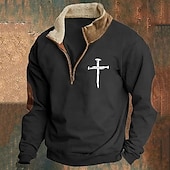 Featuring a distinctive half-zip neckline, this sweatshirt offers adjustable ventilation. The unique design elements include an embroidered or printed cross motif on the chest for an edgy look and contrasting suede or faux leather patches on the sleeves, enhancing its rugged style appeal.