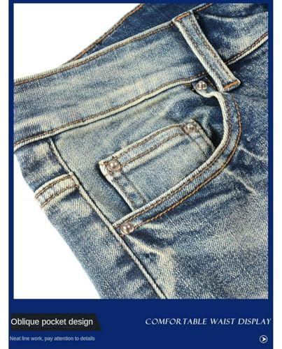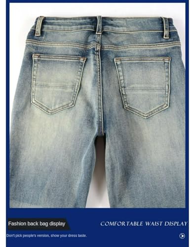 More information about Jeans Pants Trousers Denim Light Blue Trendy Street Splicing Worn Hole Piercing Patchwork Hairy Edge Tassel Elastic Slim Fit Casual Straight Leg Men(Light Blue,33)