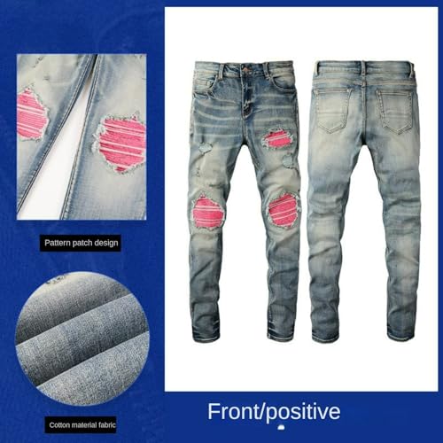 HOT ! Jeans Pants Trousers Denim Light Blue Trendy Street Splicing Worn Hole Piercing Patchwork Hairy Edge Tassel Elastic Slim Fit Casual Straight Leg Men(Light Blue,33)