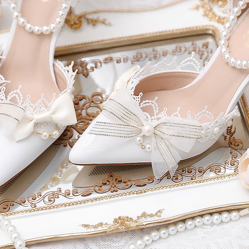 White lace trim bowknot pointed-toe hollow high-heeled women's shoes, bridal wedding dress Lolita style 1