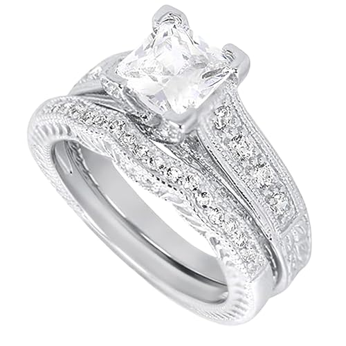 • WOMEN'S BRIDAL RING SET: 2 Piece Wedding and Engagement Ring Set for Women. Made in Sterling Silver with a 1.5 CARAT Bright White Princess Cut CZ Center Stone in a Vintage 4 Prong Setting