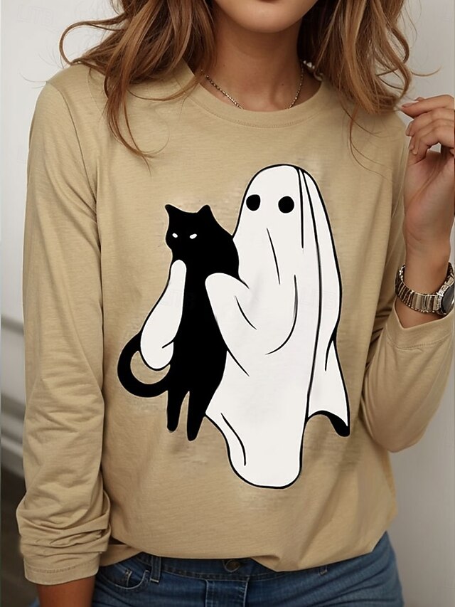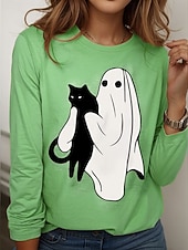 More information about Halloween Women's T shirt Ghost Crew Neck Long Sleeve Tunic Graphic Cat Vintage Stylish Classic Round Neck Regular Tops Daily Weekend Print Pink Blue Purple Green Khaki Spring Fall