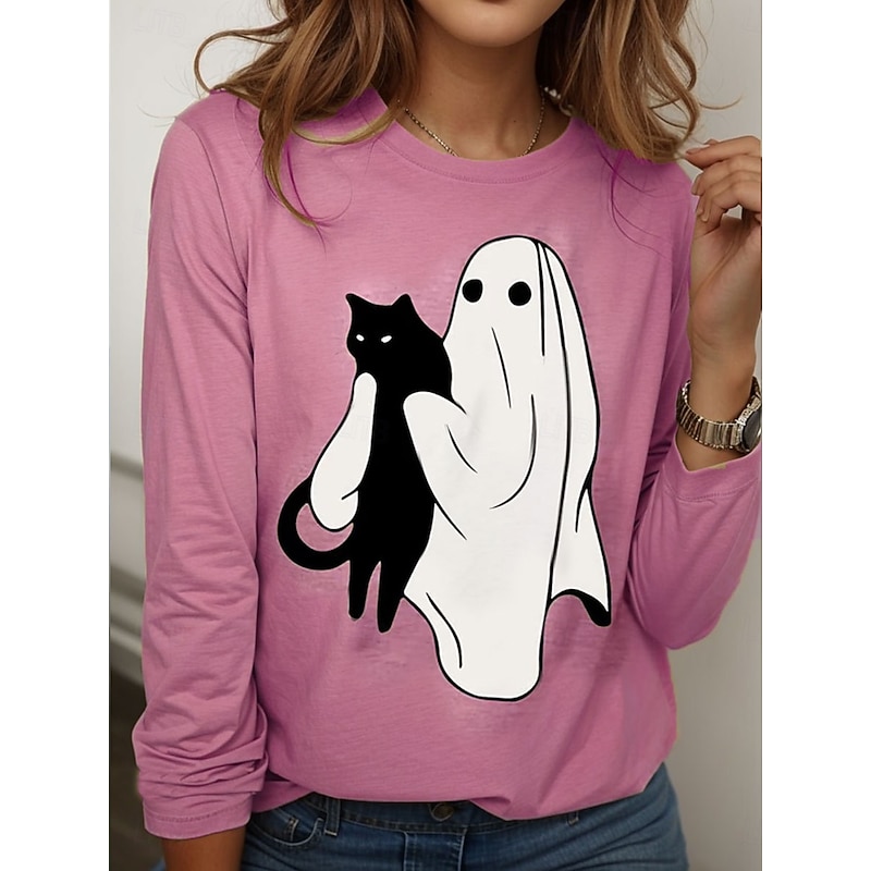HOT ! Halloween Women's T shirt Ghost Crew Neck Long Sleeve Tunic Graphic Cat Vintage Stylish Classic Round Neck Regular Tops Daily Weekend Print Pink Blue Purple Green Khaki Spring Fall
