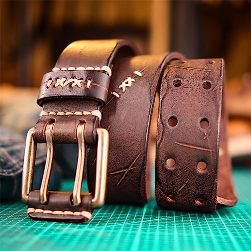 Leather Belt Heavy Duty Genuine Full Grain Leather Vintage Distressed Double Prong Belts 2 Holes Jeans Waist Belt 2