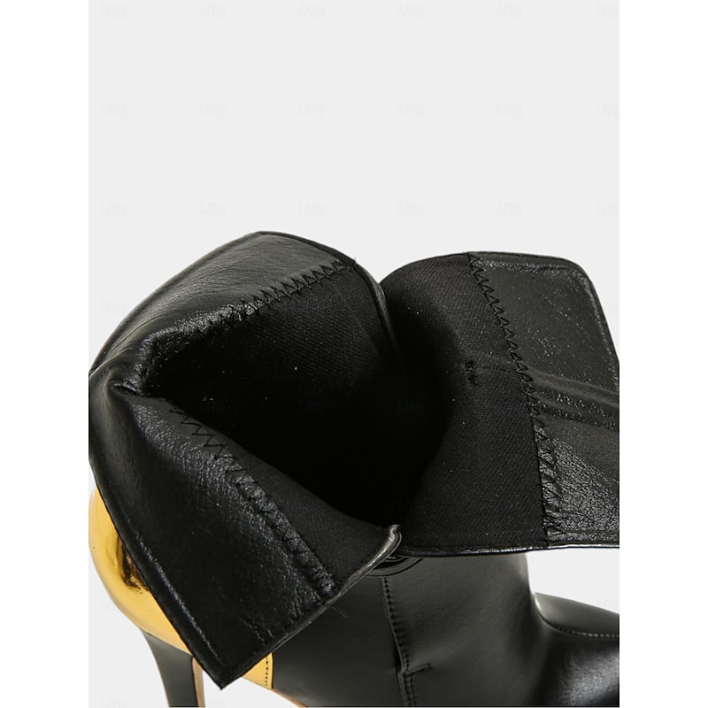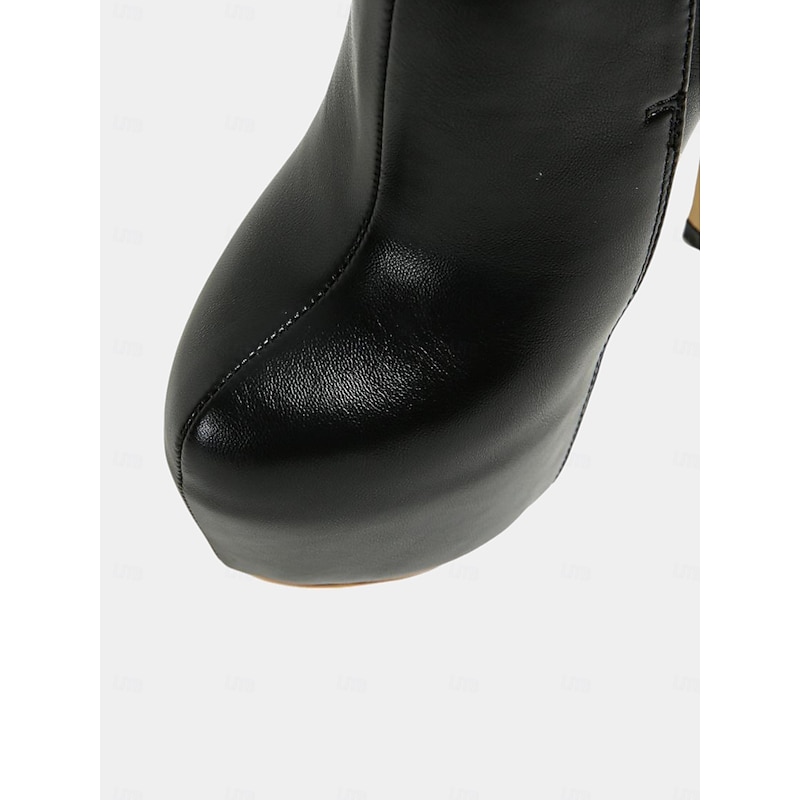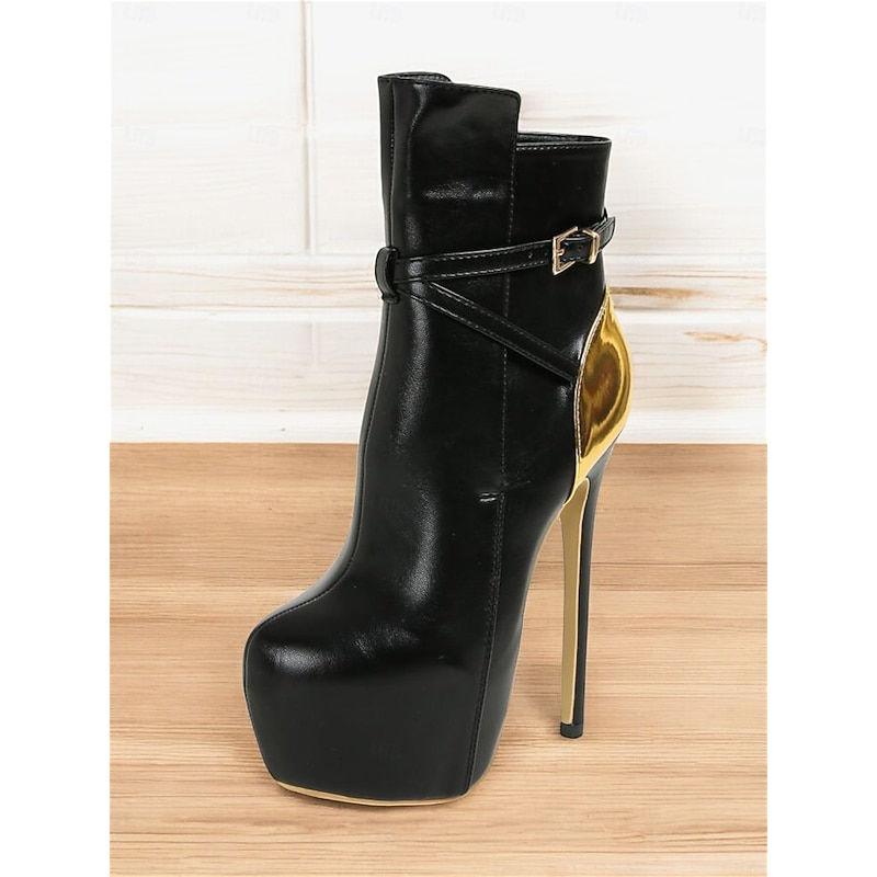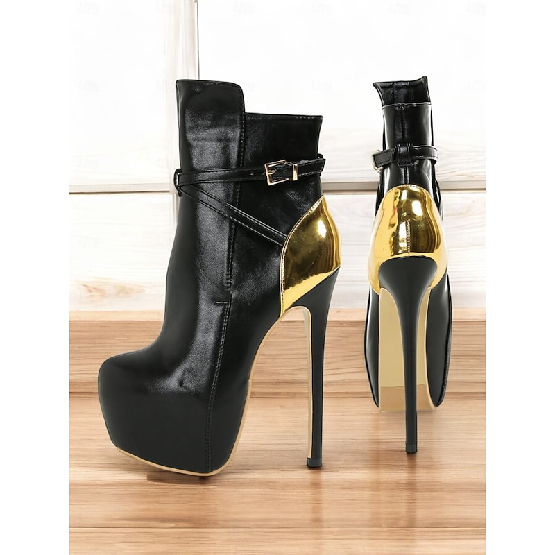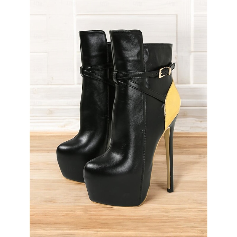 Highlights [Fabric & Material] : Crafted from high-quality synthetic PU and synthetic leather lining, these platform stiletto ankle boots offer a sleek and glossy finish that ensures durability and style. The foam rubber outsole provides excellent grip and comfort for all-day wear. [Silhouette & Shape] : These boots feature a closed, rounded toe and a towering stiletto heel that beautifully elongates the leg line. The platform front is designed to offer extra height and balance with ease, delivering both style and comfort. [Design Highlights] : Stand out with the striking red color and unique gold accent at the back, bringing a touch of opulence and flair to your outfit. The chic strap with a subtle buckle detail not only ensures a secure fit but also enhances the sophisticated look of these ankle-high boots. [Occasions] : Ideal for fashion-forward individuals who want to make a statement, these ankle boots are perfect for nights out or special occasions. Whether attending a party or a stylish evening event, these boots are sure to attract attention and elevate any ensemble. [Size Suggestion] : Available in a wide range of sizes from US5.5 / EU35 / UK3.5 / CN35 to US10.5 / EU42 / UK8.5 / CN43, ensuring a suitable fit for various foot sizes. We recommend selecting your usual size for the best fit.