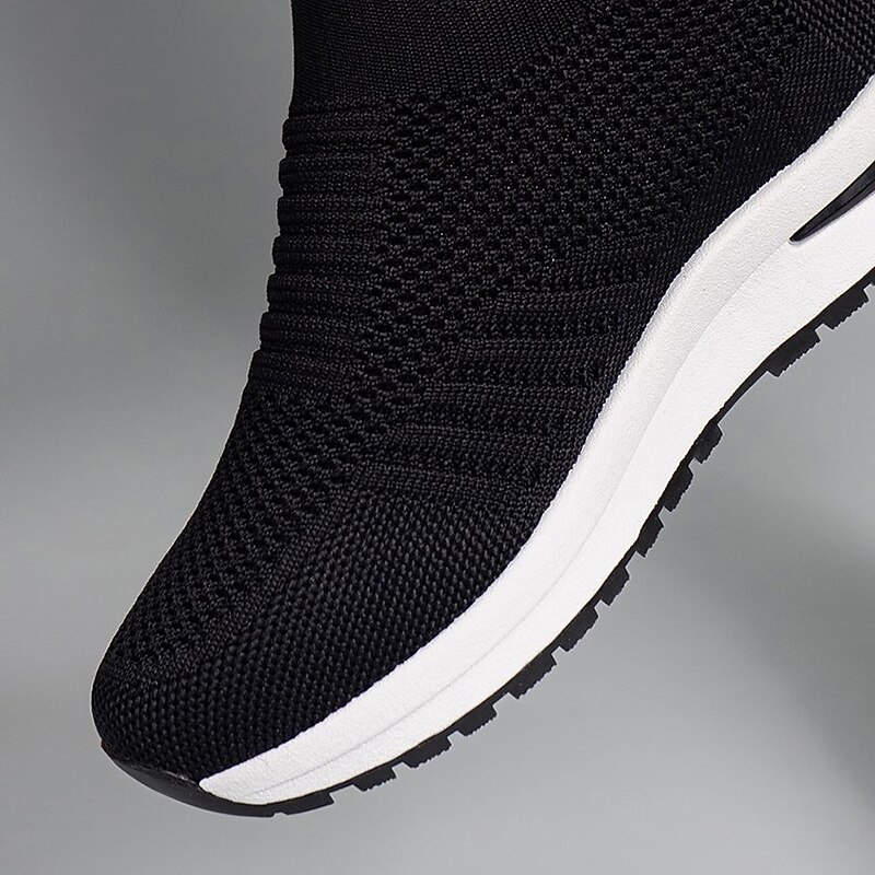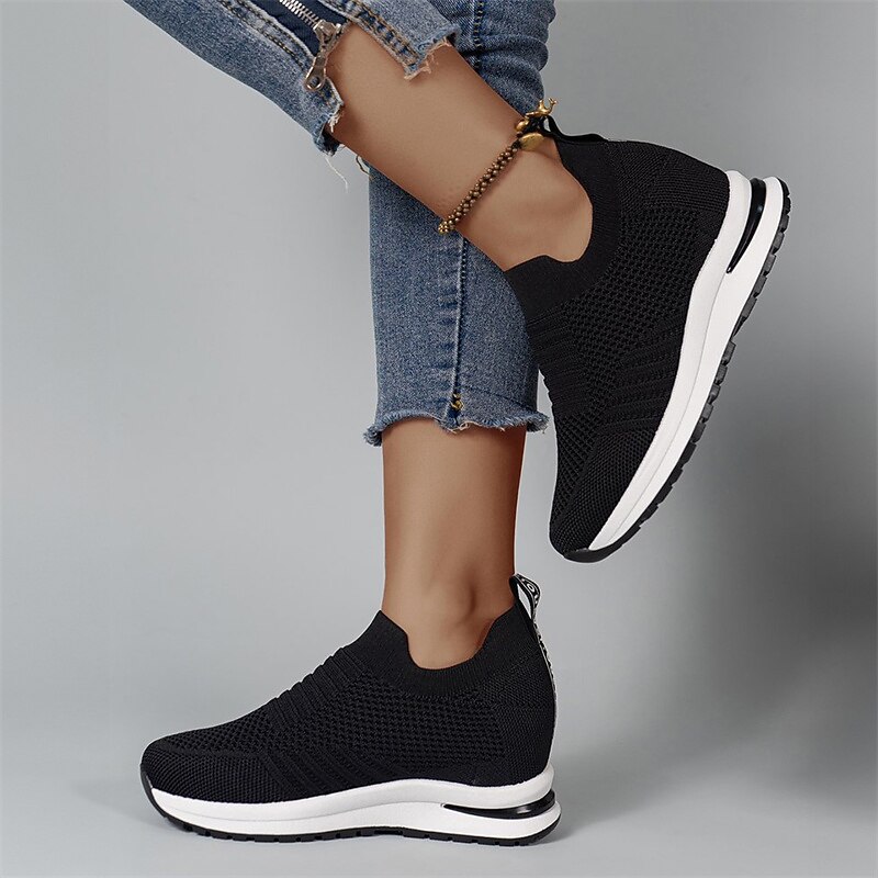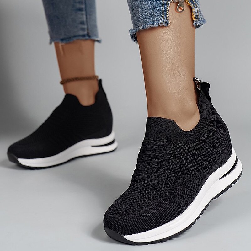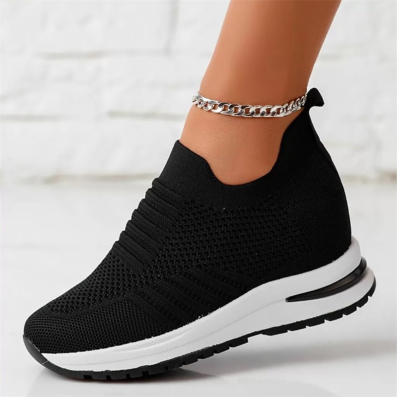 Highlights [Fabric] Crafted with high-quality elastic fabric, these women's slip-on knit sneakers offer a breathable and flexible feel, perfect for all-day comfort. The material adapts to the shape of your foot, providing a snug yet comfortable fit. [Design Profile] The sneakers boast a sleek and sporty design with a solid color pattern, complemented by a hidden heel for a subtle boost. The round toe shape and durable rubber outsole provide excellent grip and support, making these sneakers ideal for both indoor and outdoor activities. [Design Highlights] Featuring a clean, minimalist aesthetic, these sneakers are embellished with sequins that add a touch of sparkle and sophistication to the overall look. The lace-up closure ensures a secure fit, while the slip-on style offers convenience and ease of wear. [Occasions] Perfect for daily wear, walking, and casual outings, these sneakers blend comfort and style effortlessly. Their lightweight and breathable design make them suitable for various activities, including light gym sessions and weekend getaways. [Size Range] Available in sizes US5.5 to US8.5, these sneakers accommodate a wide range of fits, catering to different foot sizes and ensuring everyone can enjoy their stylish design and comfort.