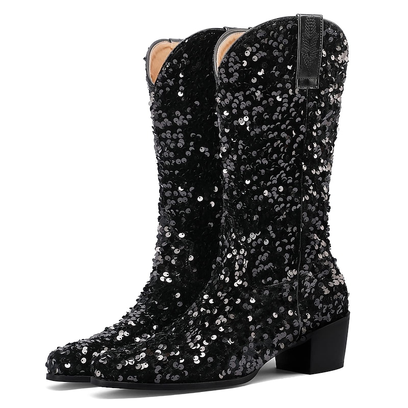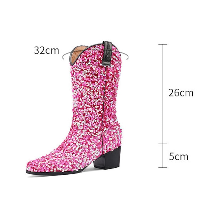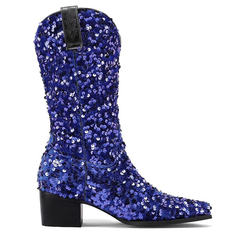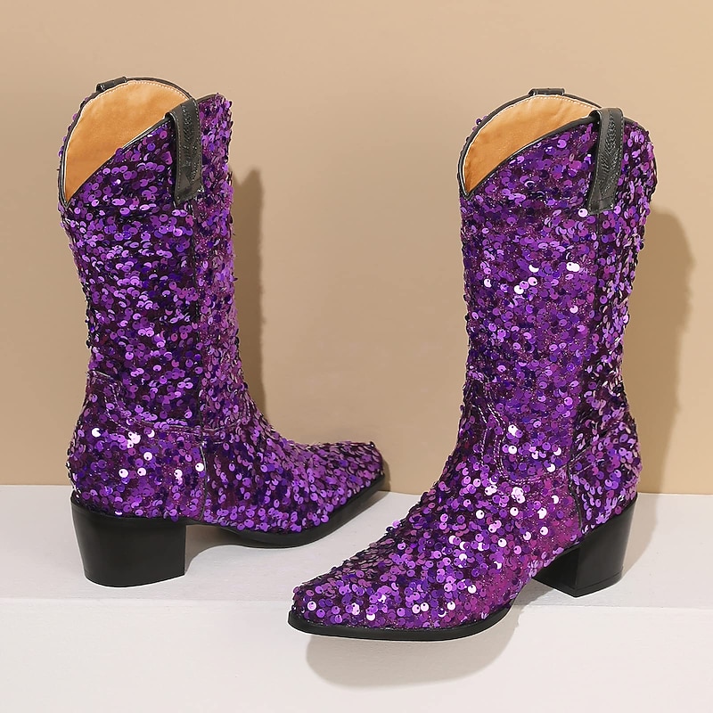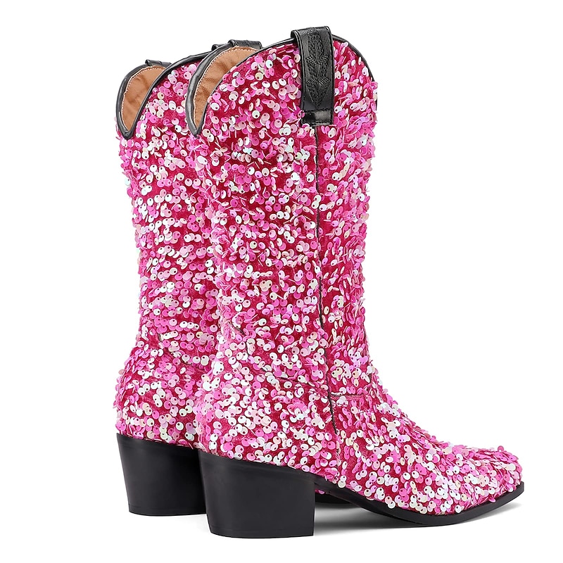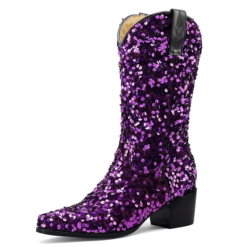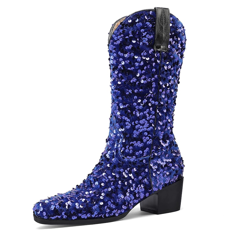 Highlights [Fabric]: Crafted from high-quality PU upper material, these women’s mid-calf boots combine a durable outer with a comfortable soft lining to keep your feet cozy during winter outings. The sturdy rubber outsole ensures longevity and dependable traction. [Silhouette]: Featuring a classic Western-inspired silhouette, the boots have a chic pointed toe and a practical chunky block heel, offering a fashionable yet stable fit for all-day comfort. [Design Highlights]: These boots are adorned with dazzling sequins that add a touch of glitter and glamour to any ensemble. Available in vibrant colors like gold, pink, black, purple, and blue, they allow for versatile styling, and the pull-on design ensures ease of wear. [Occasions]: Ideal for making a bold fashion statement at parties, festivals, or any event where standing out is essential. These boots elevate any daily, work, or outdoor outfit with their elegant and fashionable flair. [Size Range]: Available in a wide range of sizes from US6 to US10.5, accommodating various foot sizes for a perfect fit.