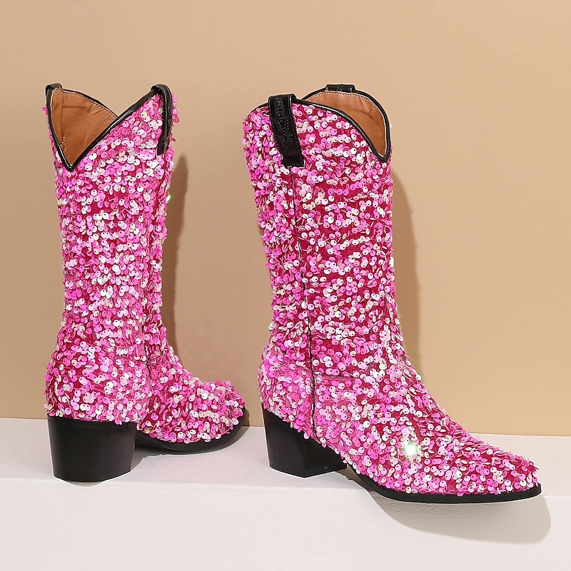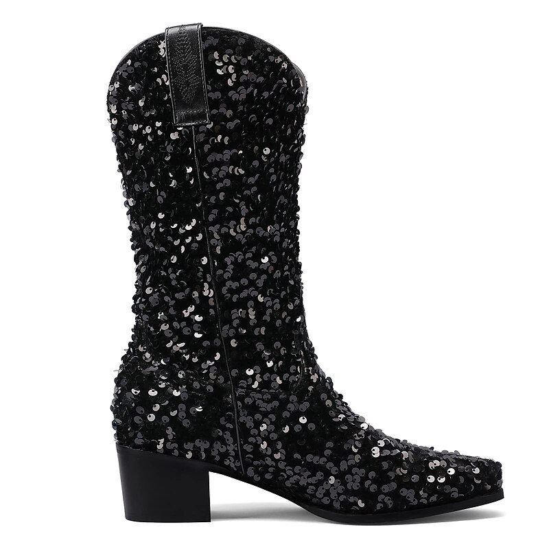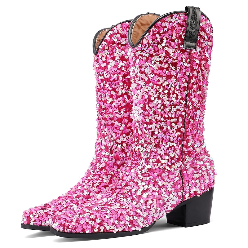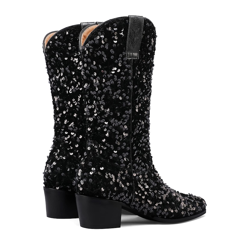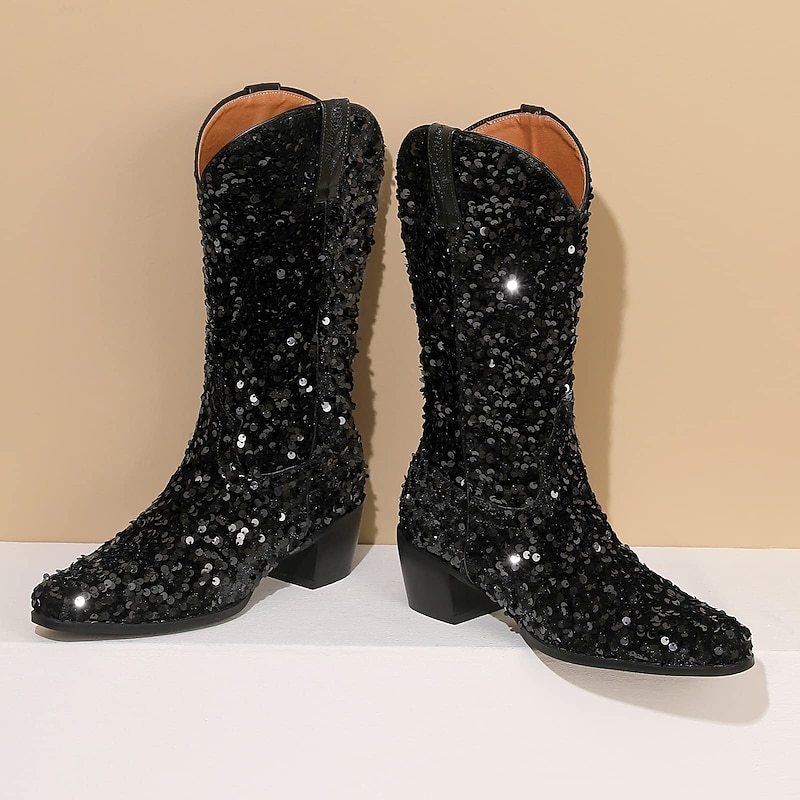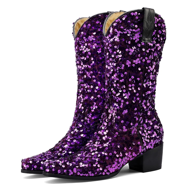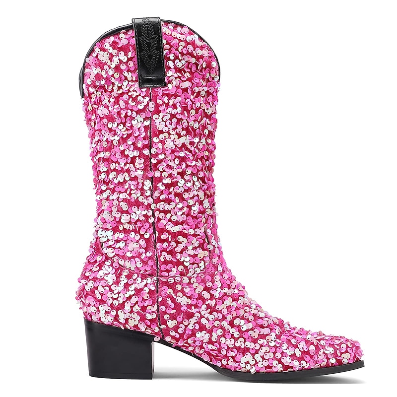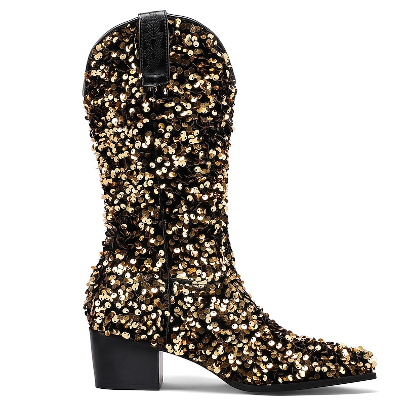 Highlights [Fabric]: Crafted from high-quality PU upper material, these women’s mid-calf boots combine a durable outer with a comfortable soft lining to keep your feet cozy during winter outings. The sturdy rubber outsole ensures longevity and dependable traction. [Silhouette]: Featuring a classic Western-inspired silhouette, the boots have a chic pointed toe and a practical chunky block heel, offering a fashionable yet stable fit for all-day comfort. [Design Highlights]: These boots are adorned with dazzling sequins that add a touch of glitter and glamour to any ensemble. Available in vibrant colors like gold, pink, black, purple, and blue, they allow for versatile styling, and the pull-on design ensures ease of wear. [Occasions]: Ideal for making a bold fashion statement at parties, festivals, or any event where standing out is essential. These boots elevate any daily, work, or outdoor outfit with their elegant and fashionable flair. [Size Range]: Available in a wide range of sizes from US6 to US10.5, accommodating various foot sizes for a perfect fit.