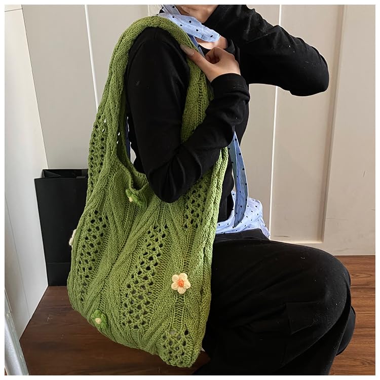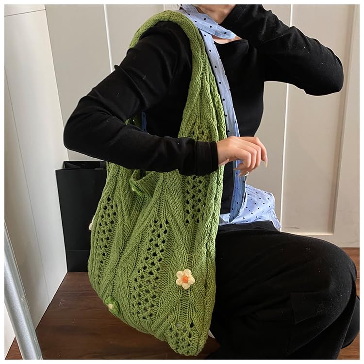 HOT ! Women Wool Knitting Shoulder Bag with Flower Knitted Tote Handbag Large Capacity Aesthetic Tote Handbag