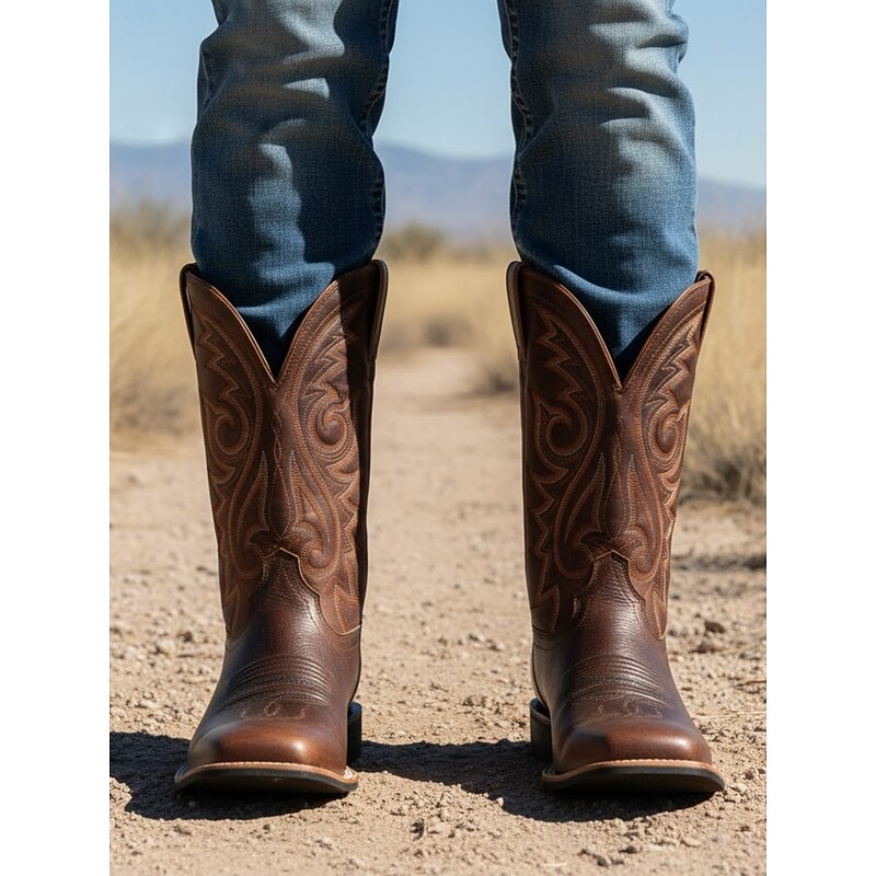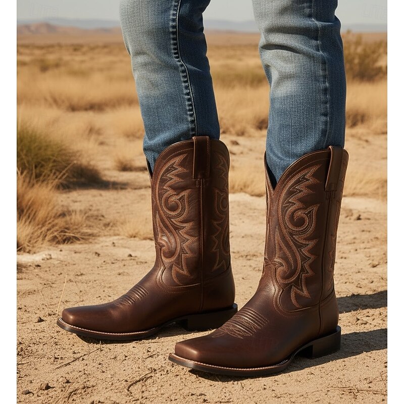 Men's Brown Embroidered Faux Leather Western Cowboy Boots - Classic Durable Square Toe Rodeo Style for Ranch and Outdoor Wear 12