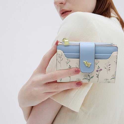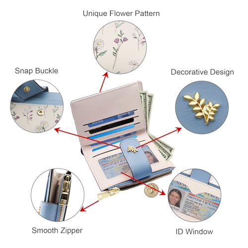 HOT ! LJCZKA Small Wallets for Women Bifold Leather Zipper Pocket Wallet Credit Card Holder Floral Purse Girls Ladies with ID Window (Blue)