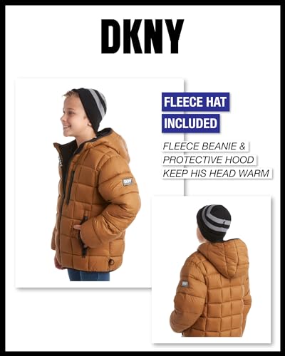 DKNY Boys' Jacket – Lightweight Checker Quilted Packable Puffer Coat with Beanie Winter Hat (8-20)
