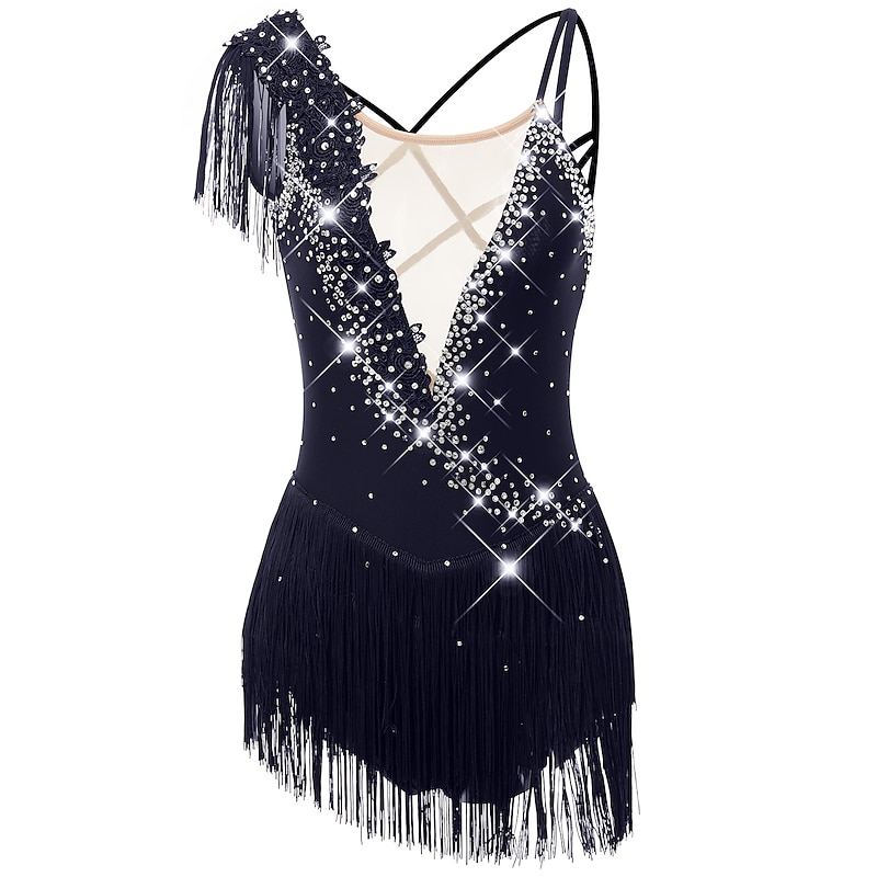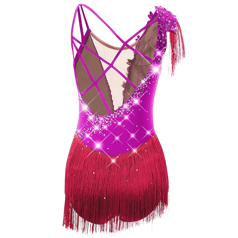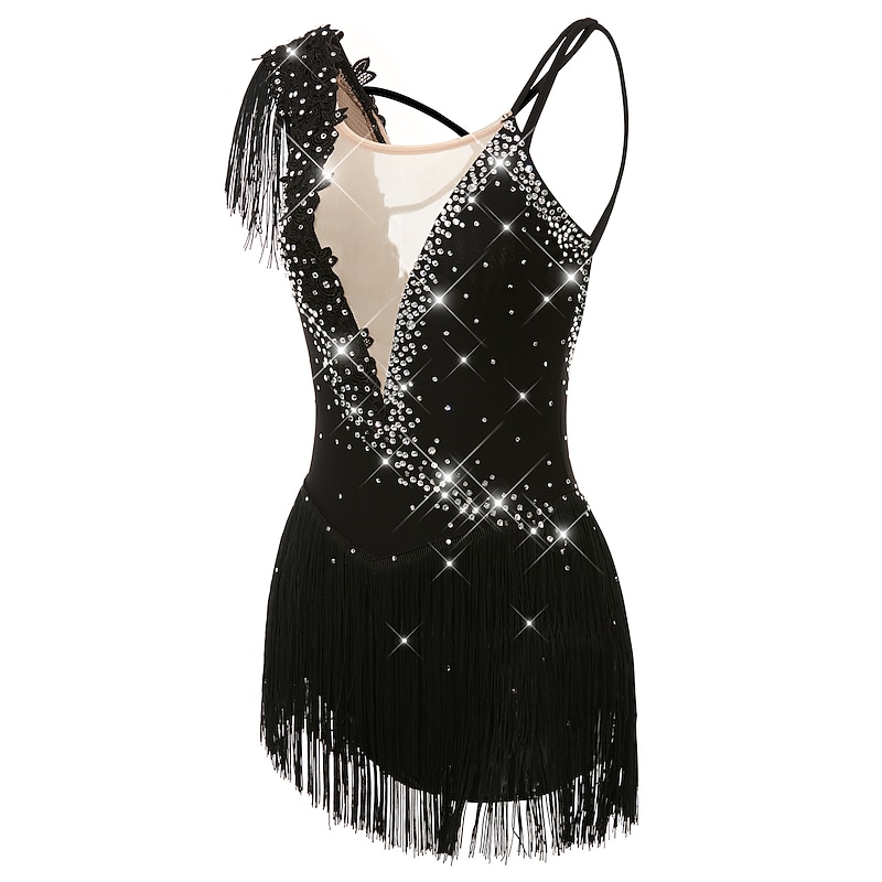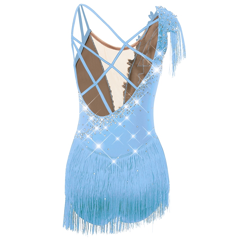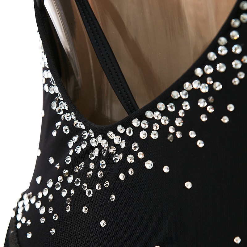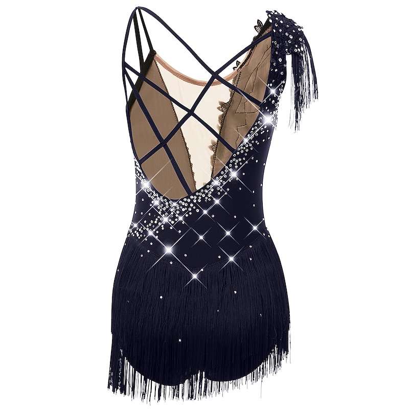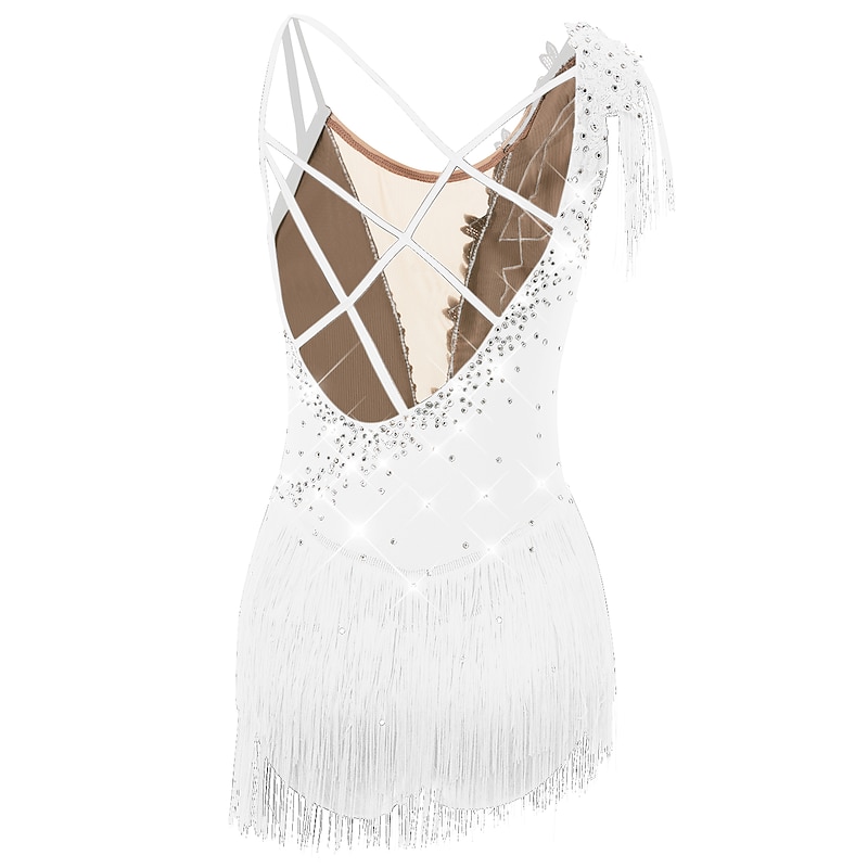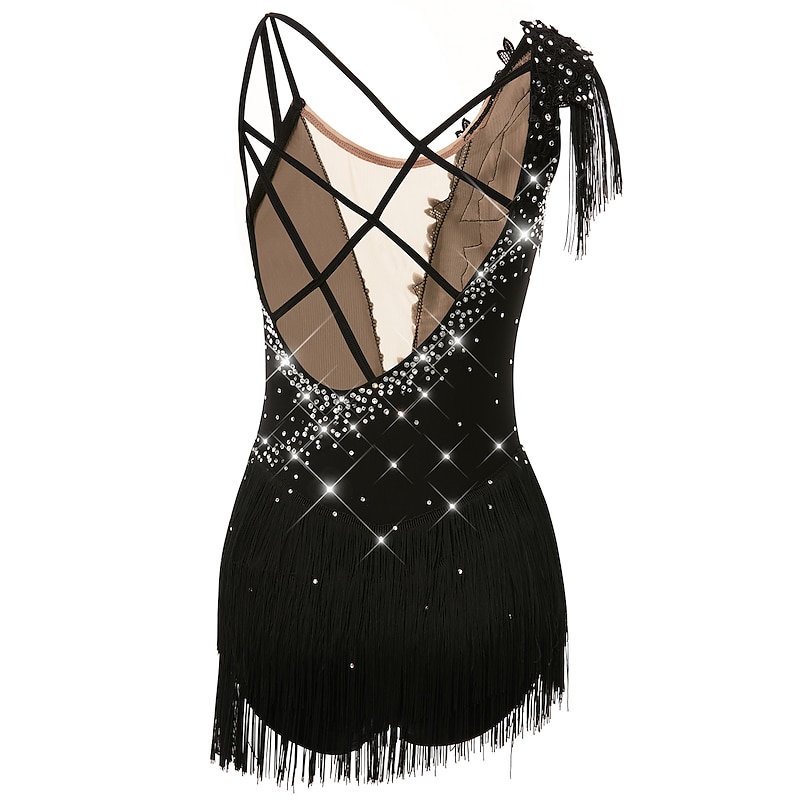 Highlights - Stunning rhinestone embellishments add a touch of glamour to this garment - Made with a comfortable and flexible spandex and mesh fabric - Sleeveless design for freedom of movement during Latin dance activities - Designed for both women and girls who want to feel confident and stylish - High elasticity allows for the perfect fit for any body type - Eye-catching criss-cross design adds a contemporary vibe - Unique asymmetric hem adds a touch of drama and elegance to your look.