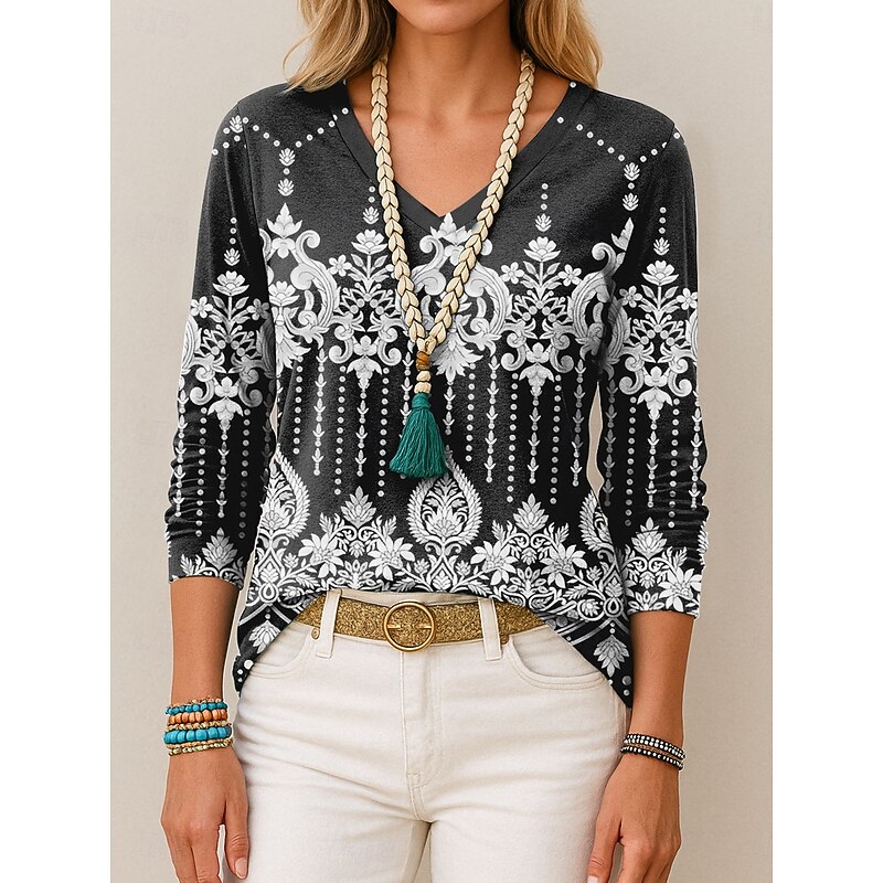 Women's T Shirt V Neck Long Sleeve Tunic Graphic Paisley Vintage Stylish Casual Regular Tops Daily Print Yellow Pink Blue Green Gray Spring Fall 9