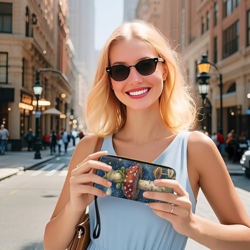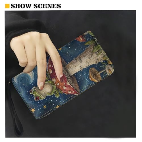 Women RFID Blocking Wallet Cute Frog Mushroom Moon Design Leather Zip Around Phone Clutch Large Capacity Ladies Travel Purse Wristlet 7