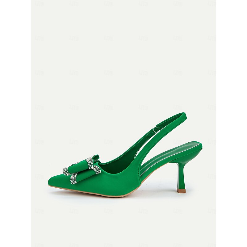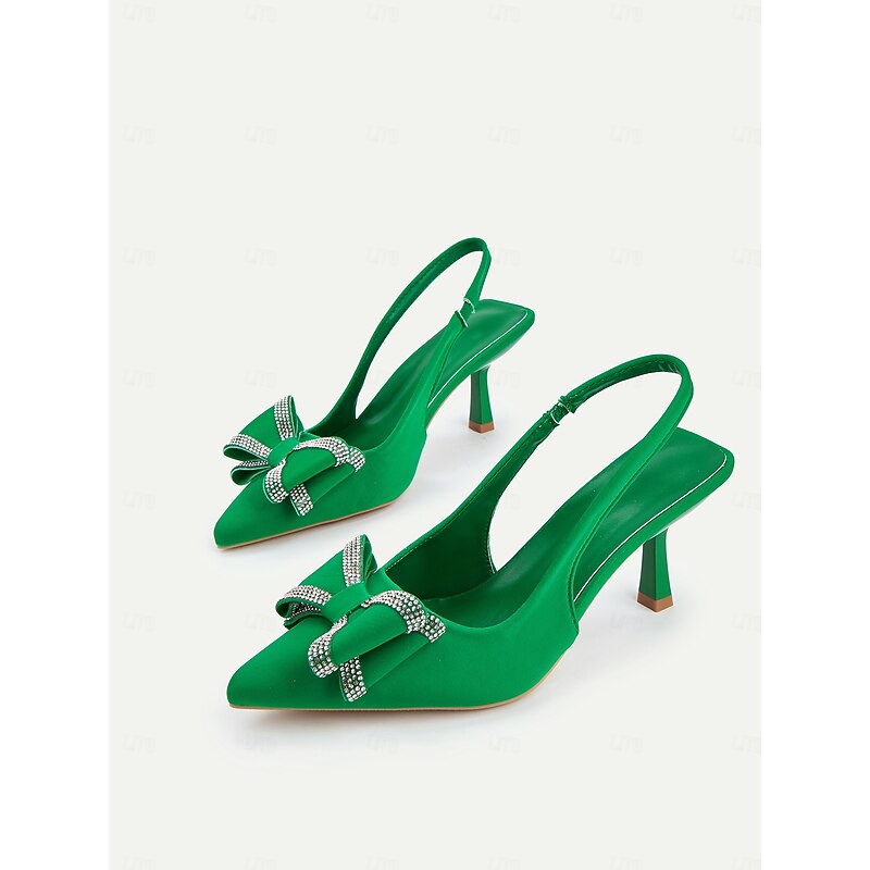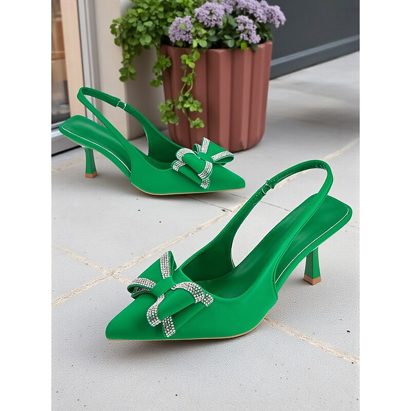 HOT ! Women's Green Slingback Kitten Heels with Rhinestone Bow - Elegant Pointed Toe Pumps for Daily Gatherings, Parties, and Formal Occasions