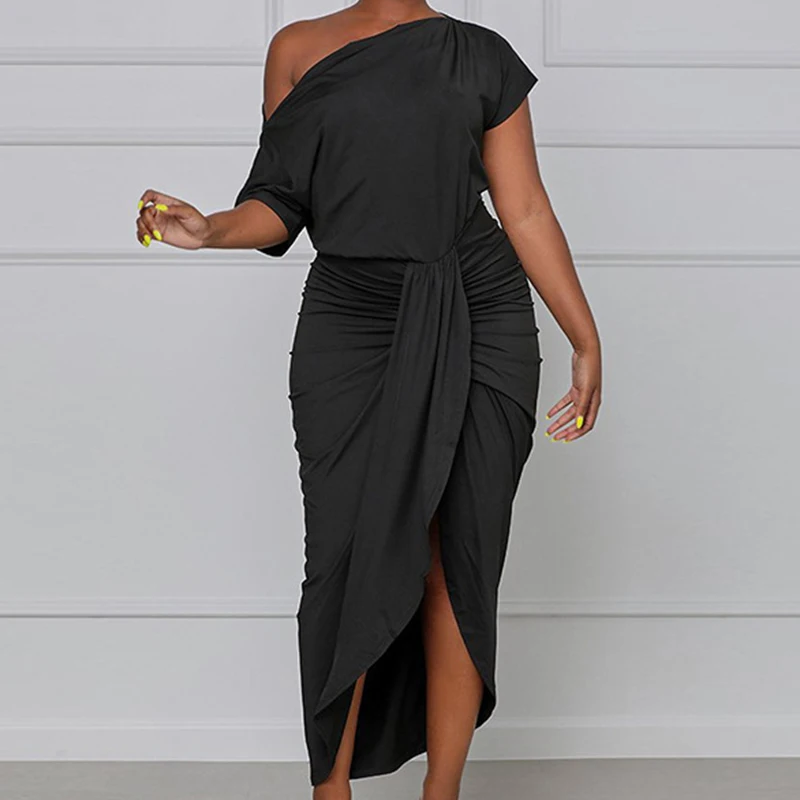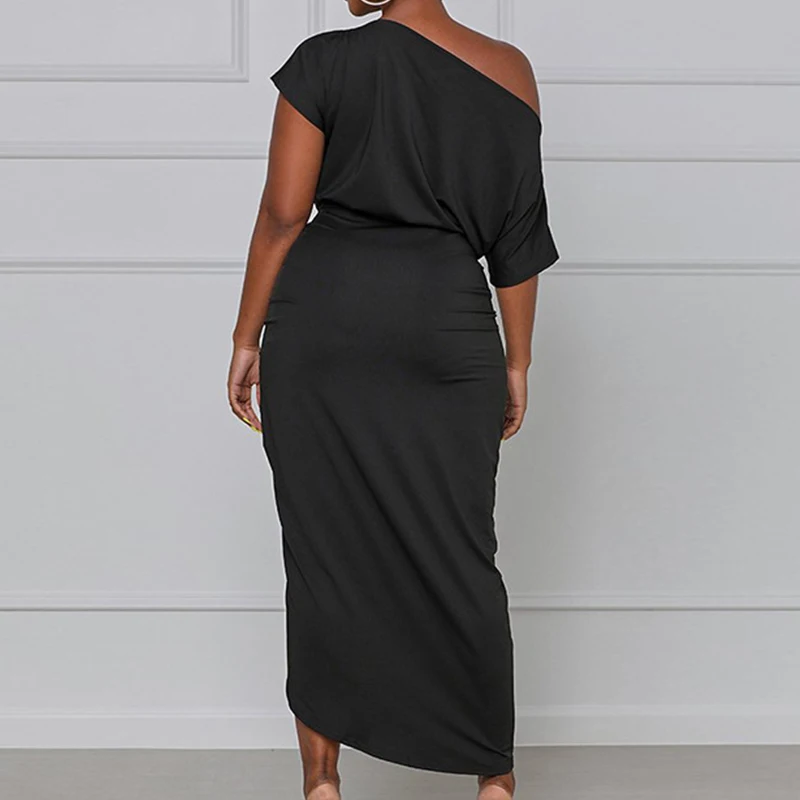 Plain Sexy Skew Neck Sheath Draped Maxi Dress Short Sleeve Party Dress. S-2X